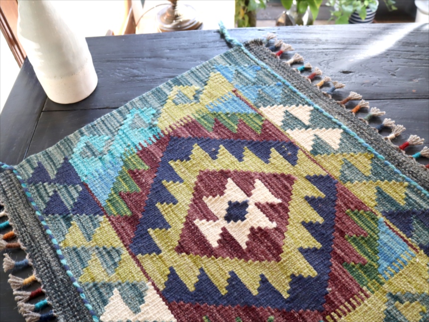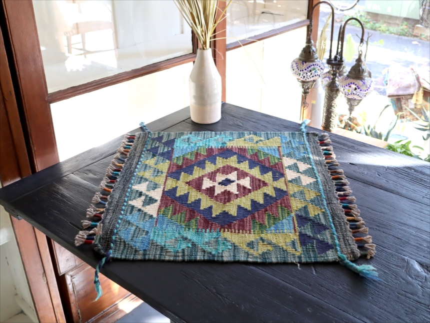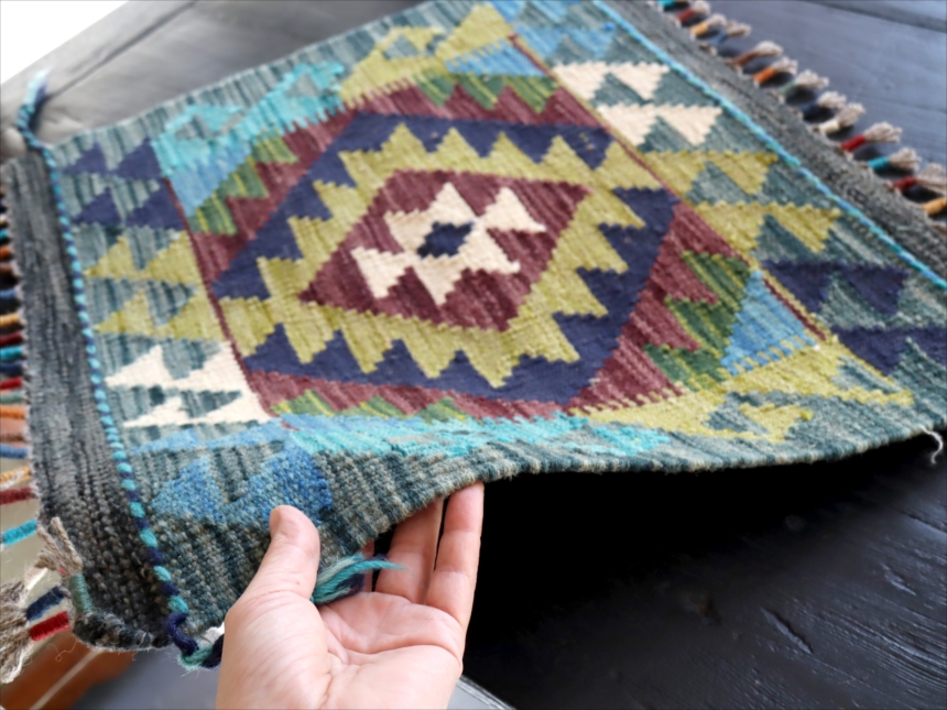 およそ50cm角のミニサイズの手織りキリムです。トルコ、イランの伝統的な幾何学モチーフを再現して、現在はアフガニスタンで織られています。ユニークなカラーコンビネーションには、織り手の自由なアイデアで織られるキリムらしさがでています。