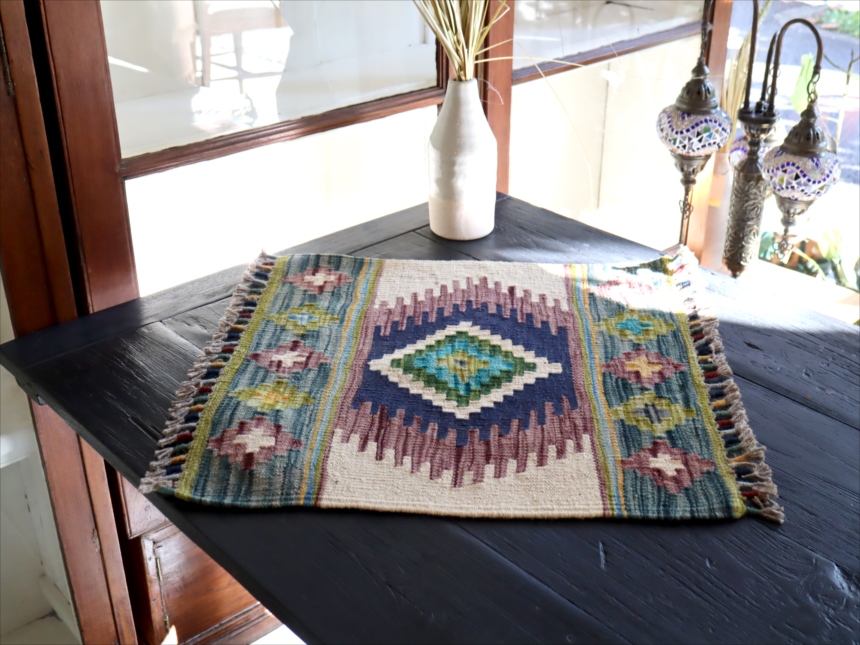 およそ50cm角のミニサイズの手織りキリムです。トルコ、イランの伝統的な幾何学モチーフを再現して、現在はアフガニスタンで織られています。ユニークなカラーコンビネーションには、織り手の自由なアイデアで織られるキリムらしさがでています。