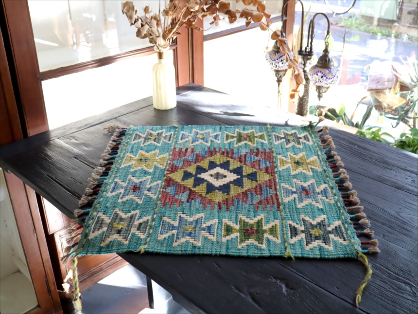 およそ50cm角のミニサイズの手織りキリムです。トルコ、イランの伝統的な幾何学モチーフを再現して、現在はアフガニスタンで織られています。ユニークなカラーコンビネーションには、織り手の自由なアイデアで織られるキリムらしさがでています。