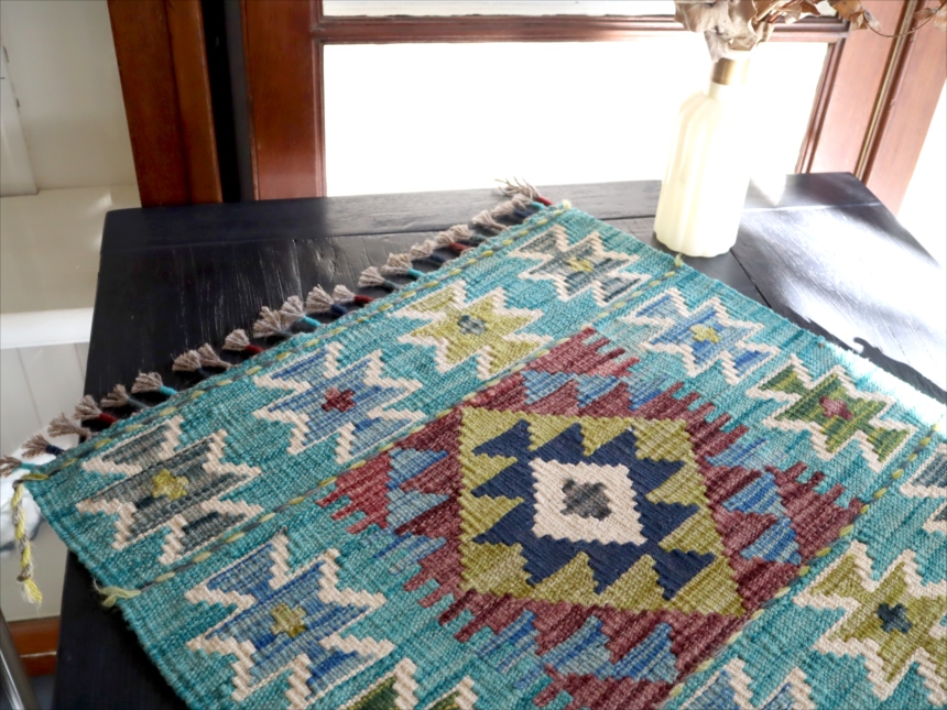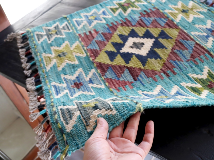 0.6-0.7mmほどの厚みのある平織りのキリムです。飾り糸がフリンジのようにのばしたままになっています。