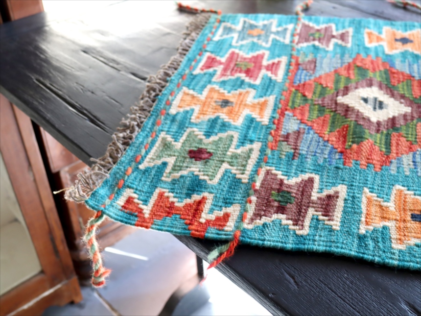 およそ50cm角のミニサイズの手織りキリムです。トルコ、イランの伝統的な幾何学モチーフを再現して、現在はアフガニスタンで織られています。ユニークなカラーコンビネーションには、織り手の自由なアイデアで織られるキリムらしさがでています。
