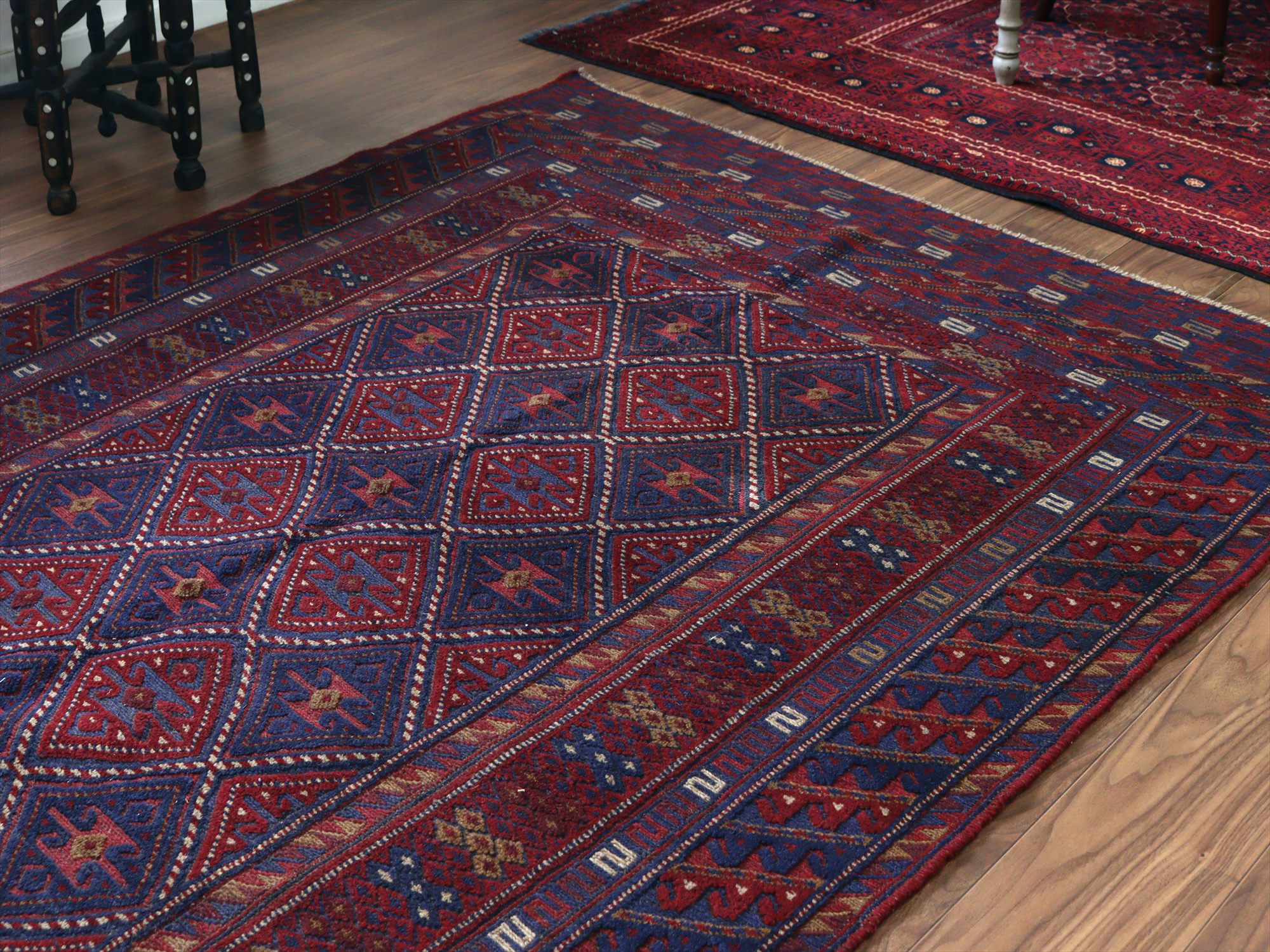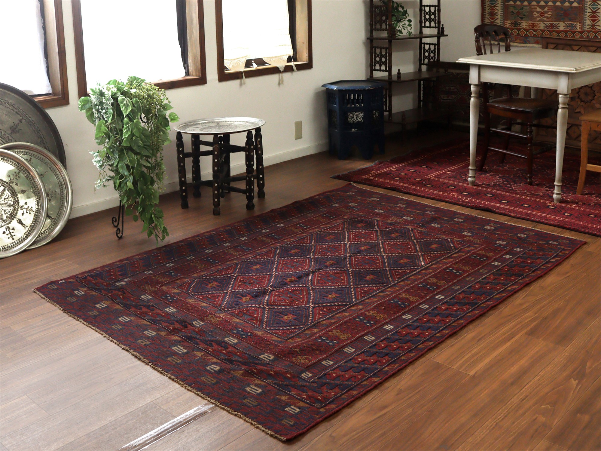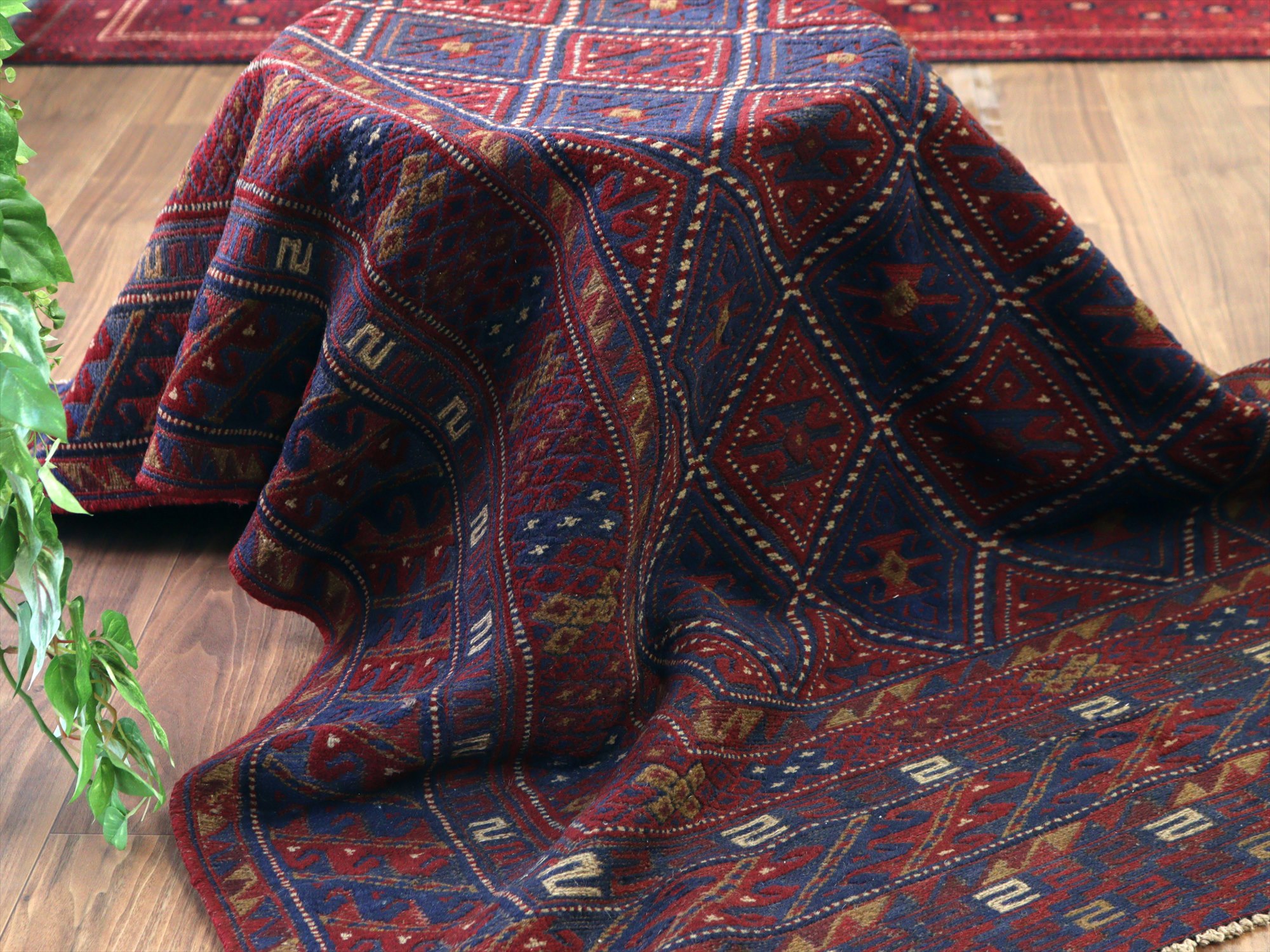 アフガニスタン東部、イランと国境を接するエリアの緻密な織りのキリムです。細かい織り目のスマック織りをベースに、立体感のあるカーペット織りでモチーフをレリーフのように織り込んだ1枚。