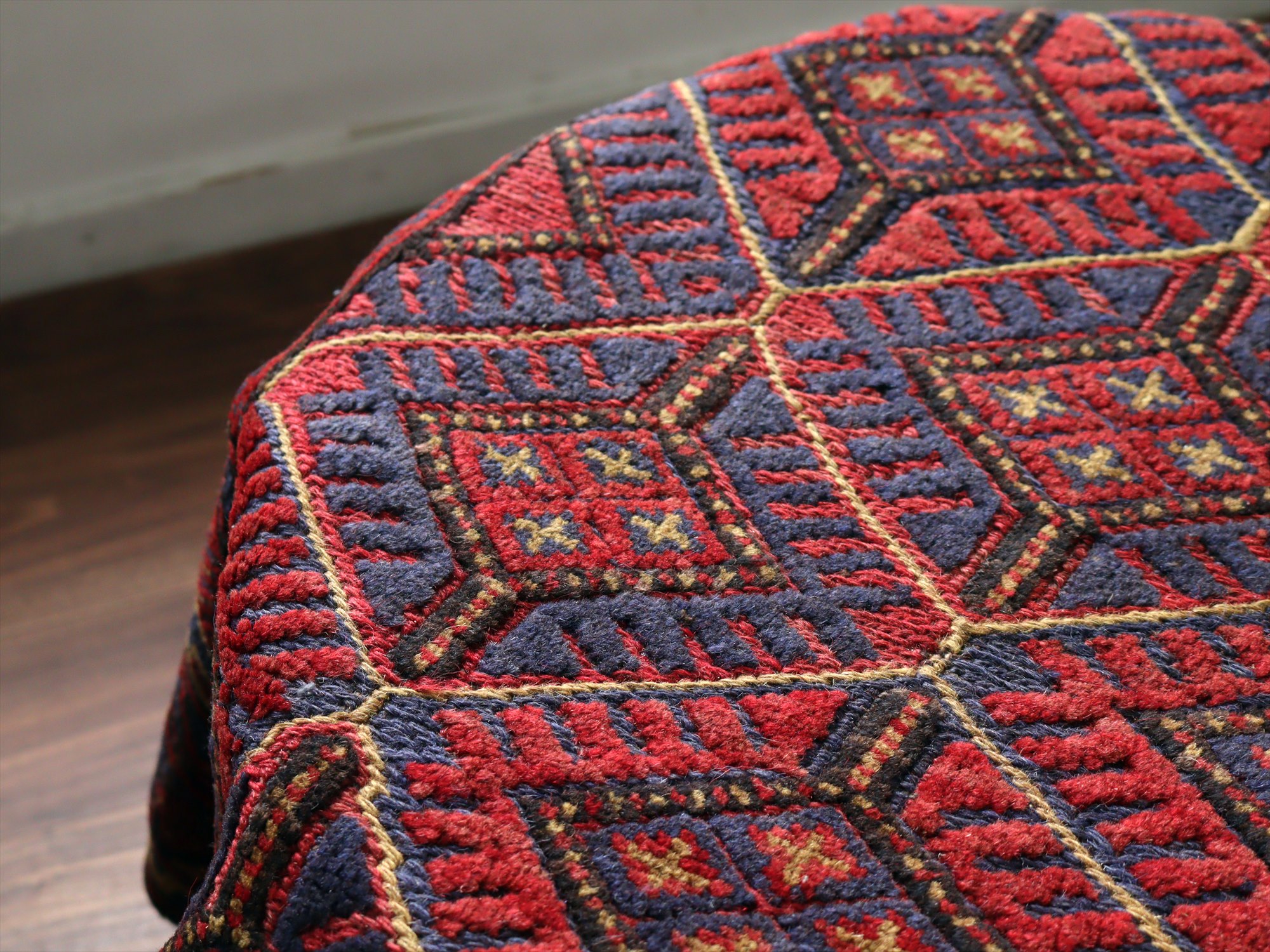 ベース地はスマック織りでしっかりとした織り地です。モチーフ部分はパイル(毛足)のある織りで、表面には立体感があります。