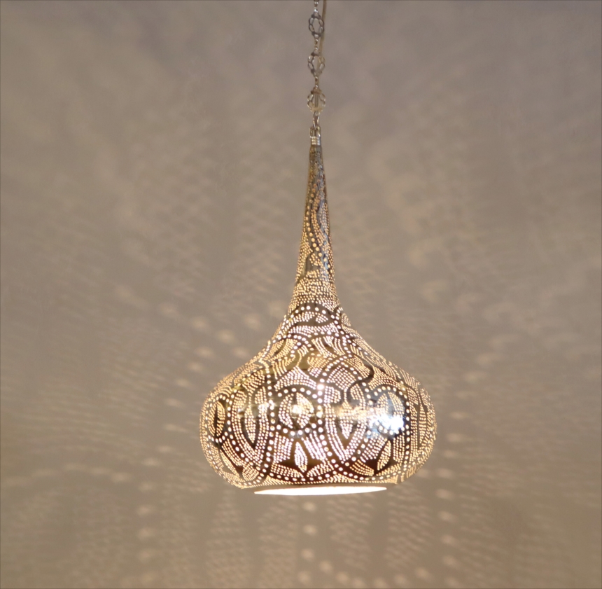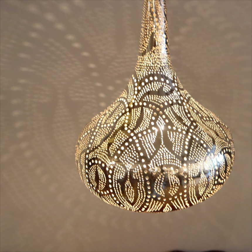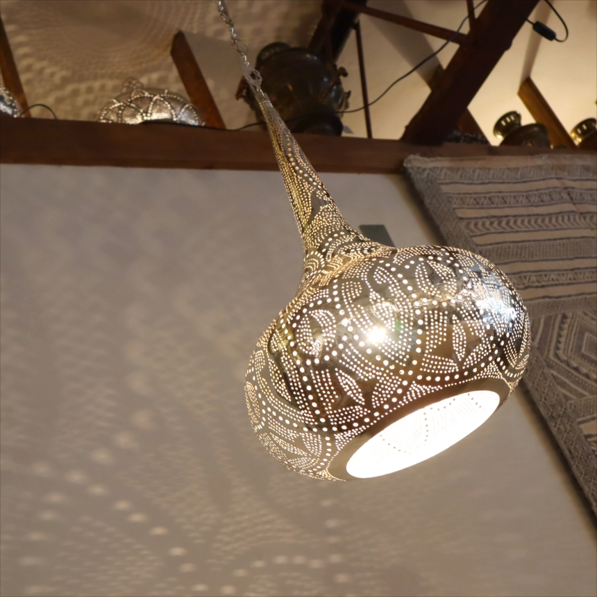 メタルを薄く加工し、コンコンと小さな穴をあけて光をデザインするランプシェードを作りました。中世から作られて来た伝統的な技法で、細工からこぼれる光が壁に映り、エキゾチックな雰囲気を楽しめます。