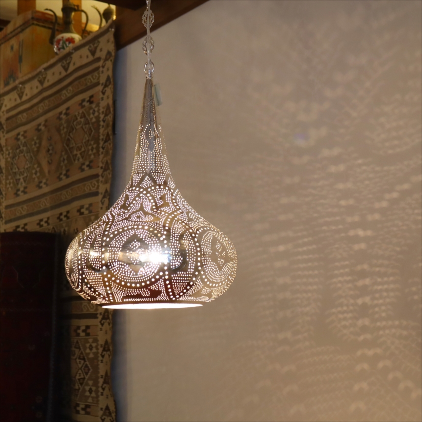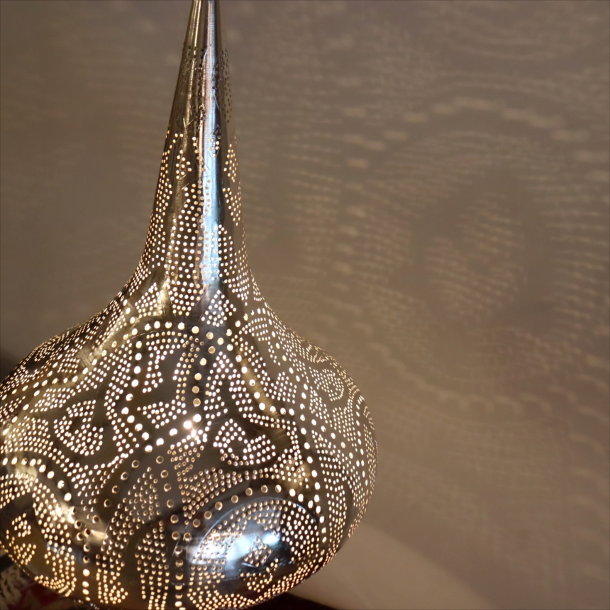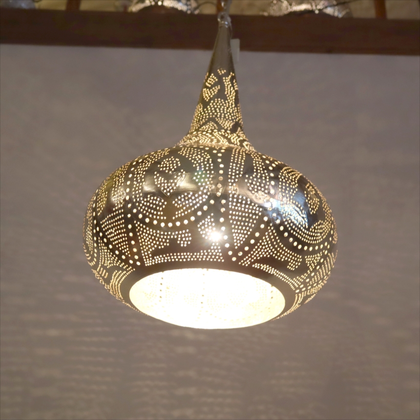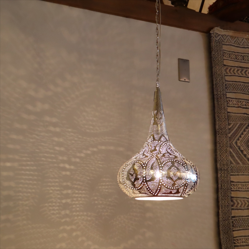 メタルを薄く加工し、コンコンと小さな穴をあけて光をデザインするランプシェードを作りました。中世から作られて来た伝統的な技法で、細工からこぼれる光が壁に映り、エキゾチックな雰囲気を楽しめます。