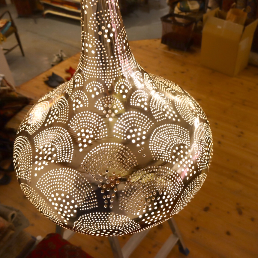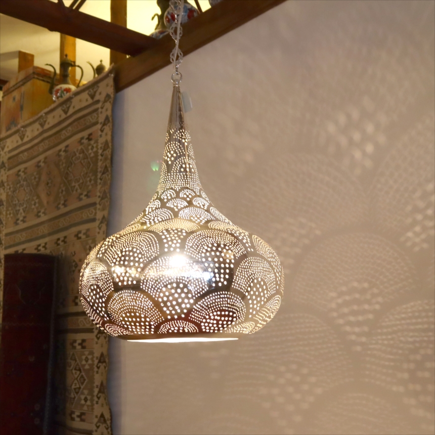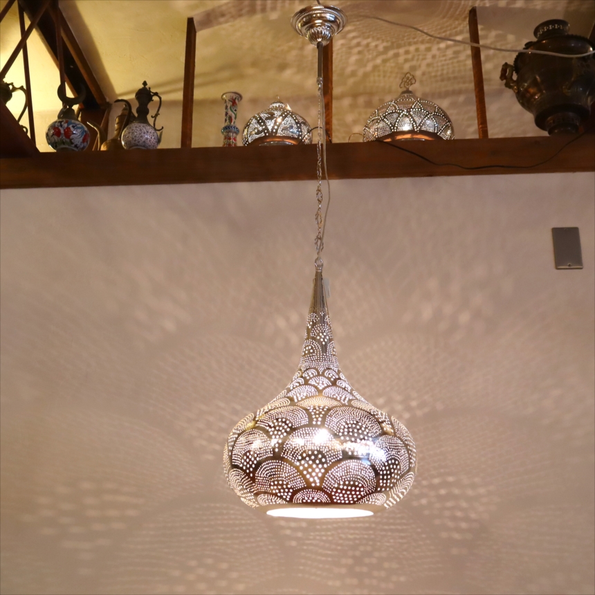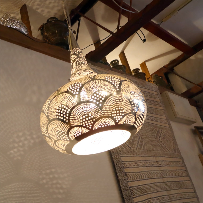 メタルを薄く加工し、コンコンと小さな穴をあけて光をデザインするランプシェードを作りました。中世から作られて来た伝統的な技法で、細工からこぼれる光が壁に映り、エキゾチックな雰囲気を楽しめます。