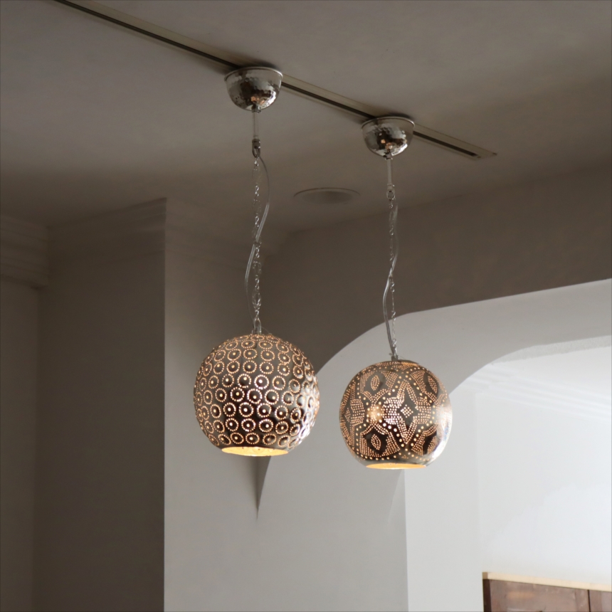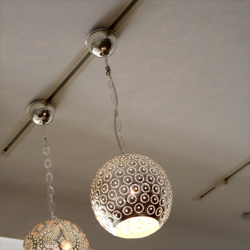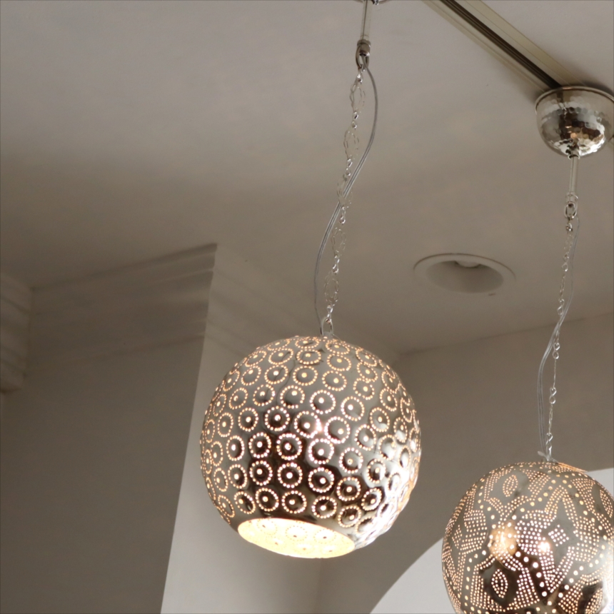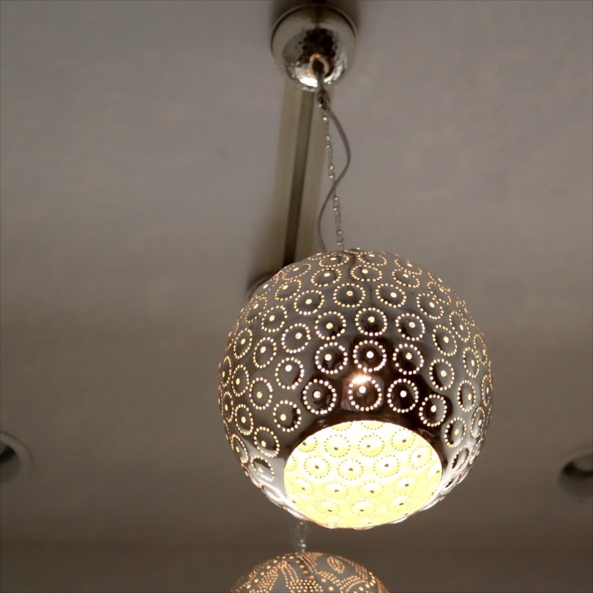 メタルを薄く加工し、コンコンと小さな穴をあけて光をデザインするランプシェードを作りました。中世から作られて来た伝統的な技法で、細工からこぼれる光が壁に映り、エキゾチックな雰囲気を楽しめます。