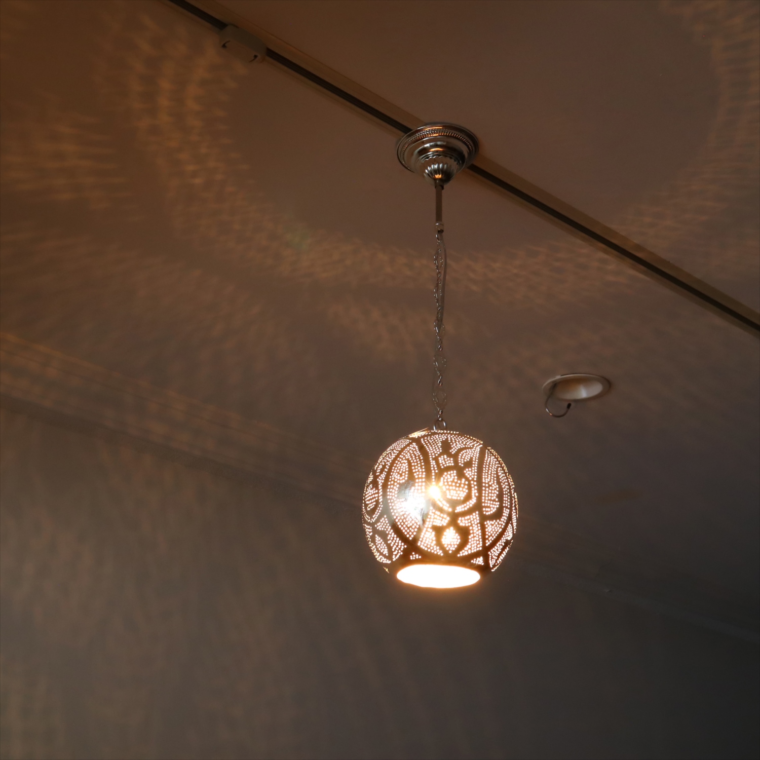 メタルを薄く加工し、コンコンと小さな穴をあけて光をデザインするランプシェードを作りました。中世から作られて来た伝統的な技法で、細工からこぼれる光が壁に映り、エキゾチックな雰囲気を楽しめます。