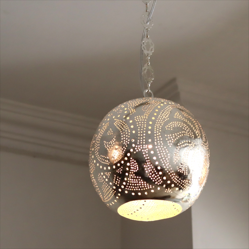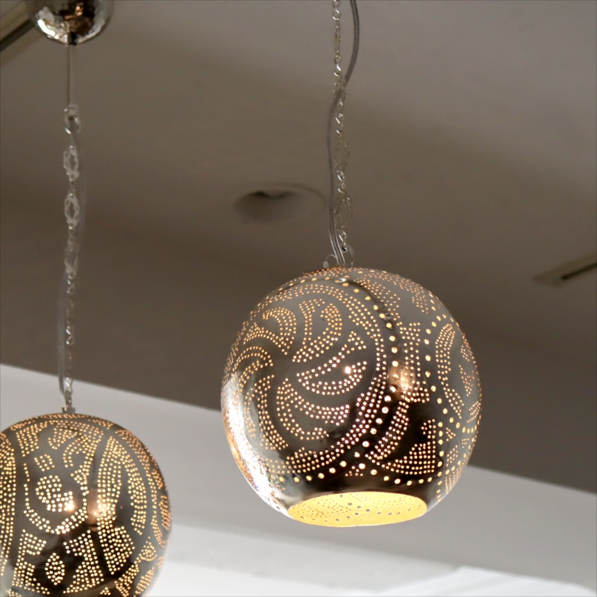 メタルを薄く加工し、コンコンと小さな穴をあけて光をデザインするランプシェードを作りました。中世から作られて来た伝統的な技法で、細工からこぼれる光が壁に映り、エキゾチックな雰囲気を楽しめます。