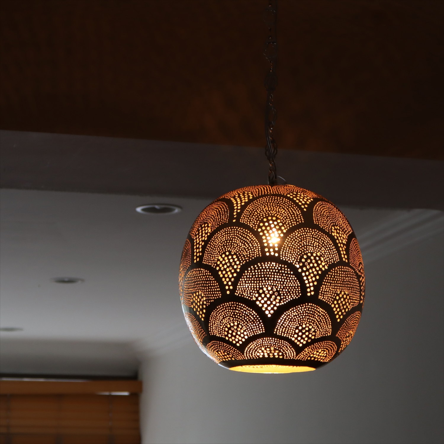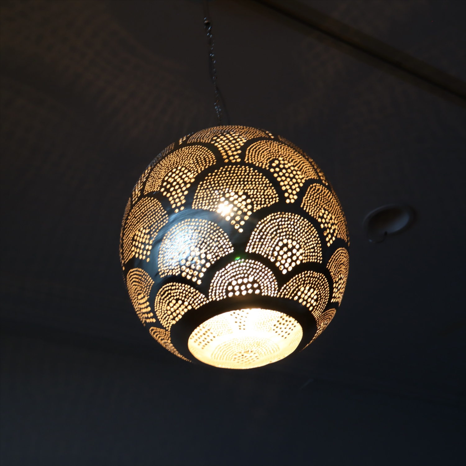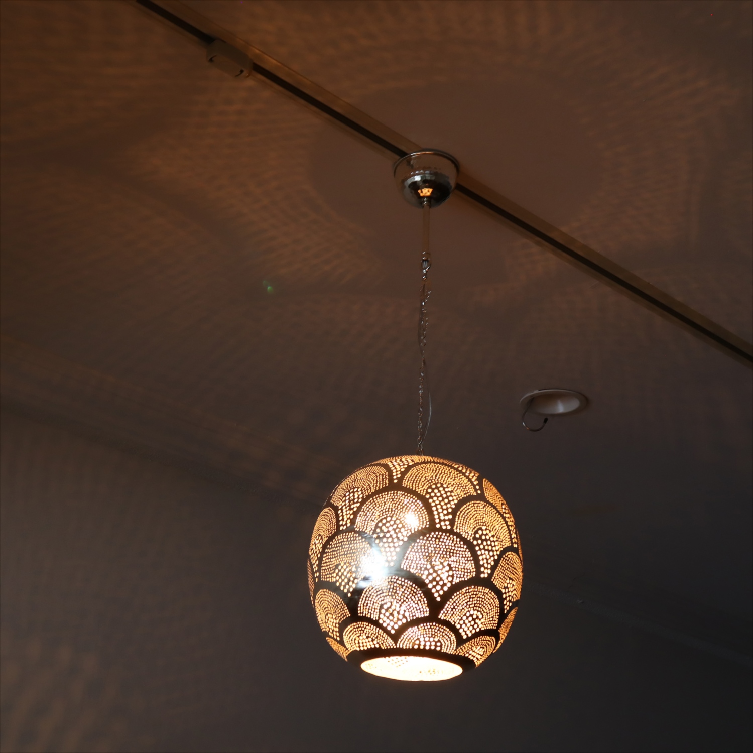メタルを薄く加工し、コンコンと小さな穴をあけて光をデザインするランプシェードを作りました。中世から作られて来た伝統的な技法で、細工からこぼれる光が壁に映り、エキゾチックな雰囲気を楽しめます。