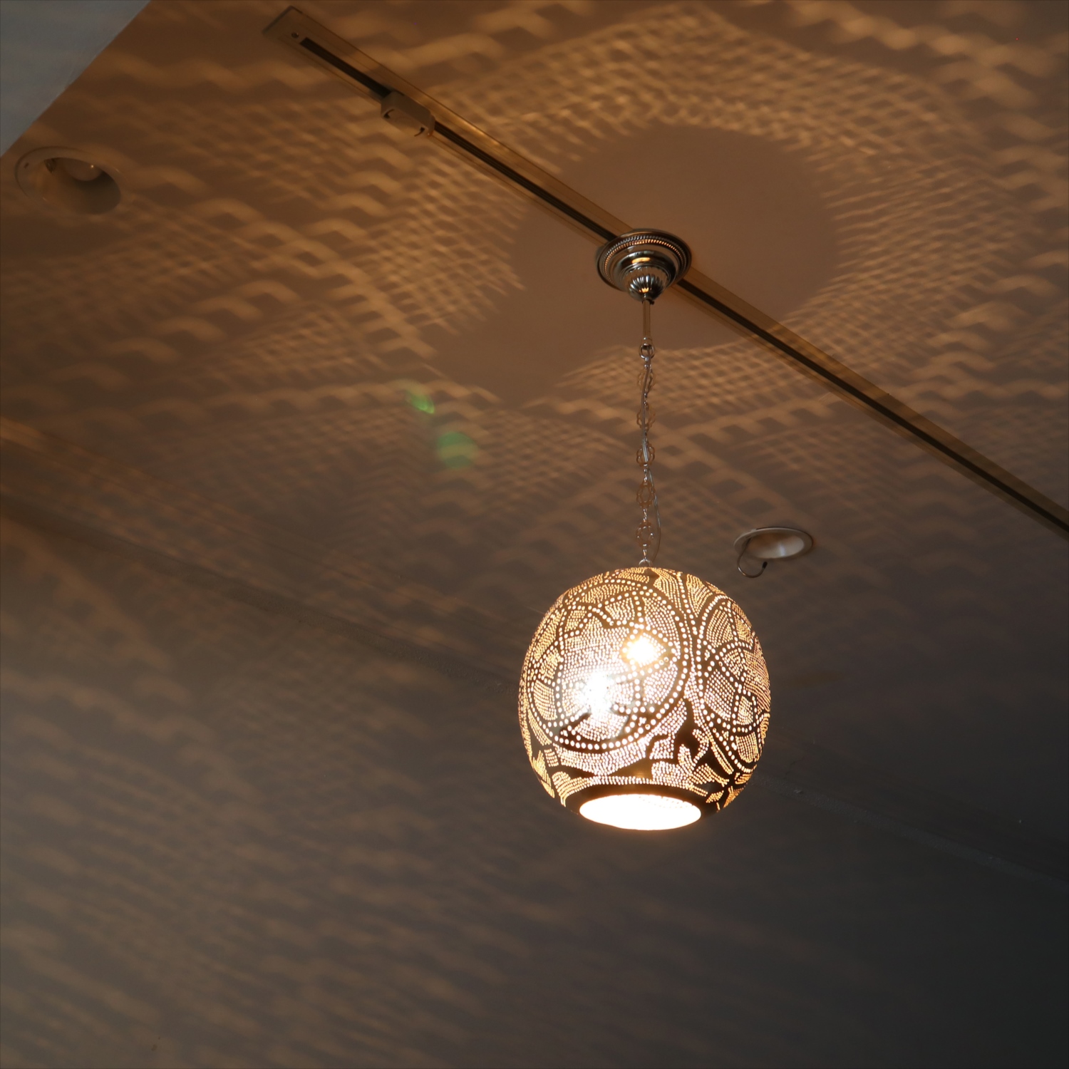 メタルを薄く加工し、コンコンと小さな穴をあけて光をデザインするランプシェードを作りました。中世から作られて来た伝統的な技法で、細工からこぼれる光が壁に映り、エキゾチックな雰囲気を楽しめます。