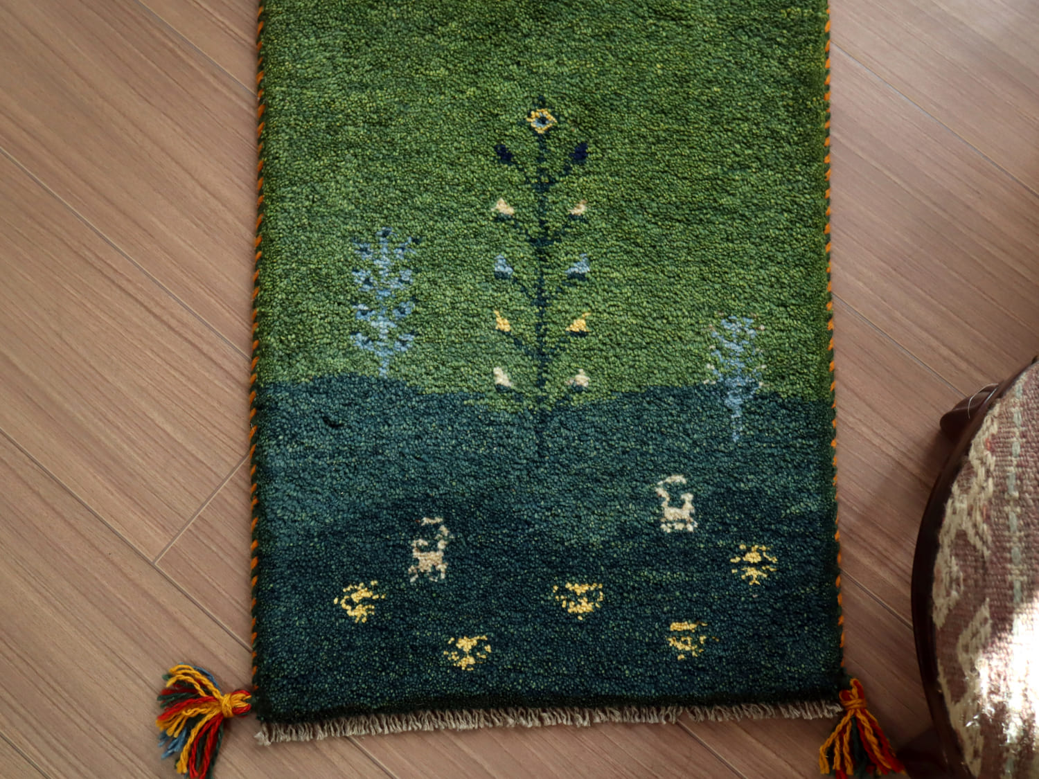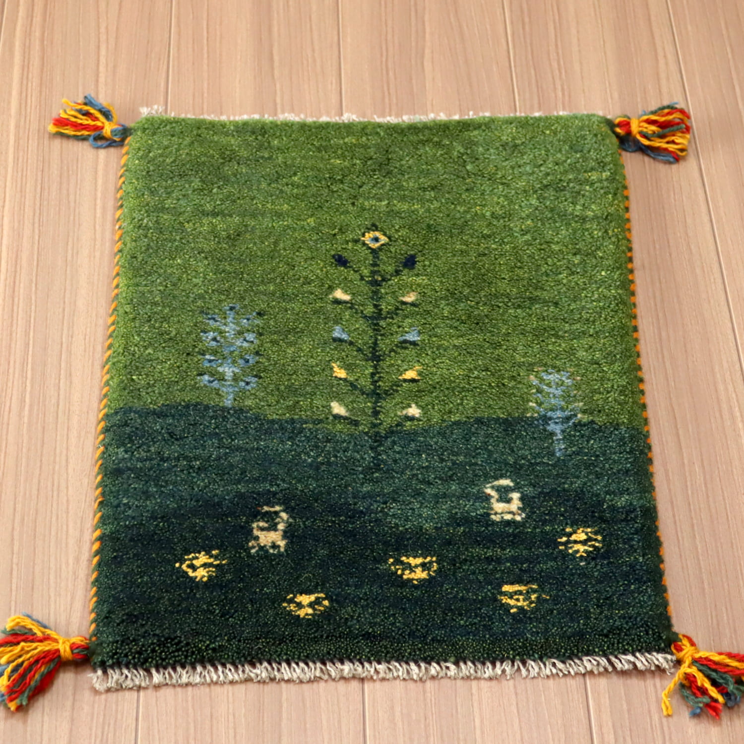 ギャッベ ミニサイズ イラン遊牧民の手織りラグ 57x41cm グリーン 花をつけた木々