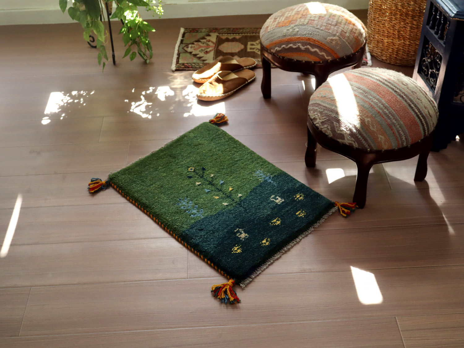 Key:Gabbeh, Tribal rug, Shiraz, Fars, Iran, Persia, Wool, ギャッベ, ギャベ, グリーン 緑 天然染料 草木染 ラグ, 絨毯, イラン, シラーズ, ペルシャ, バザールギャッベ, ポンポン, 手織り, 一点もの, 玄関マット, ふかふか, ガラタバザール