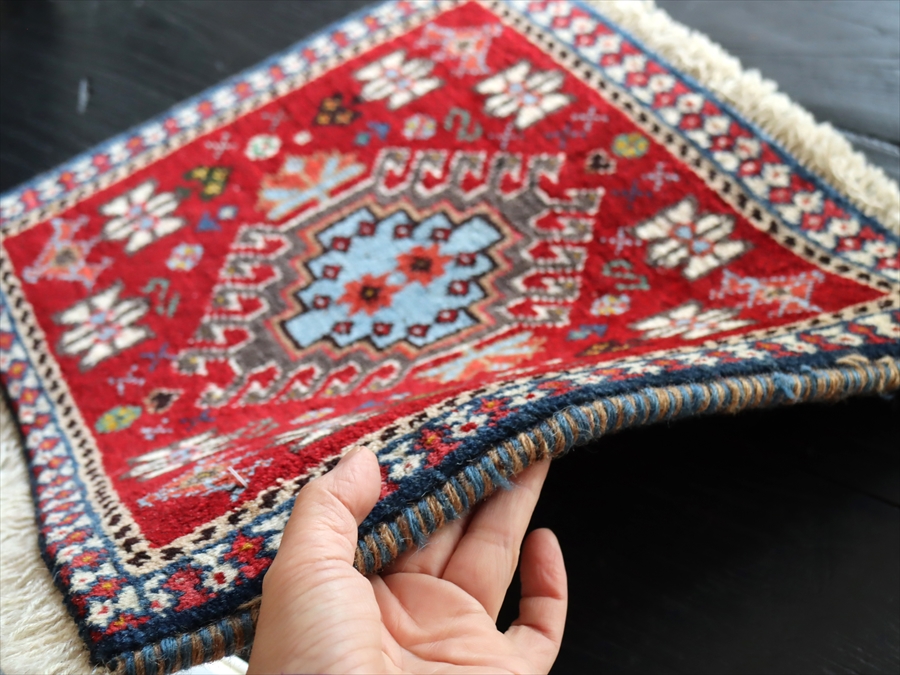 30cm角のミニサイズのラグ。小さいながらも、織りはしっかりしていて本格的です。多少ゆがみが気になりますが、ゆがみも含めて素朴な感じをお楽しみいただければと思います。