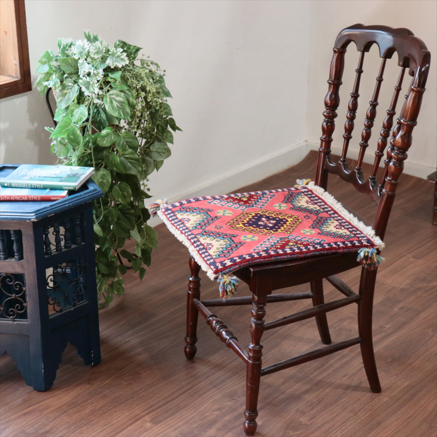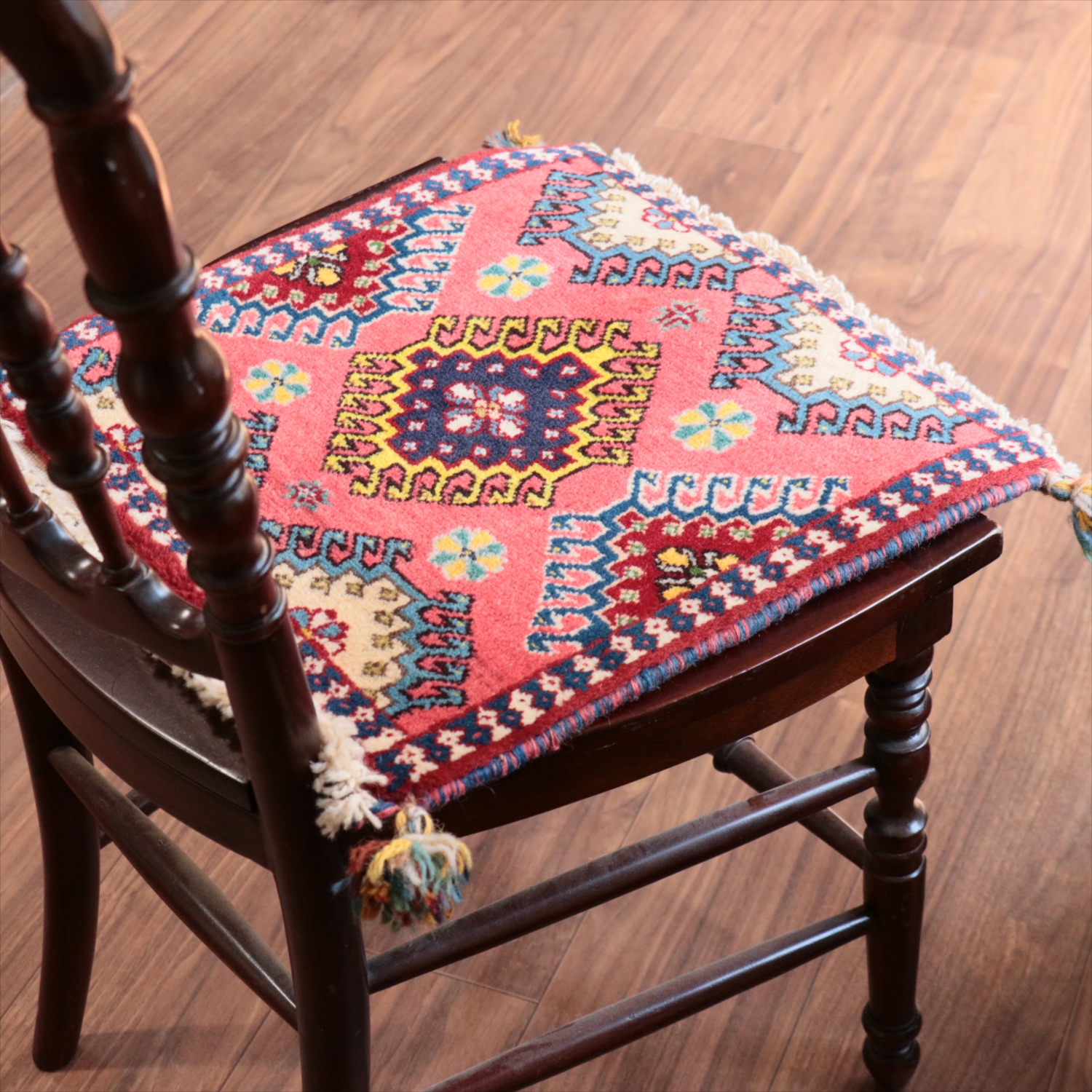 40cm角のミニサイズのラグ。小さいながらも、織りはしっかりしていて本格的です。多少ゆがみが気になりますが、ゆがみも含めて素朴な感じをお楽しみいただければと思います。