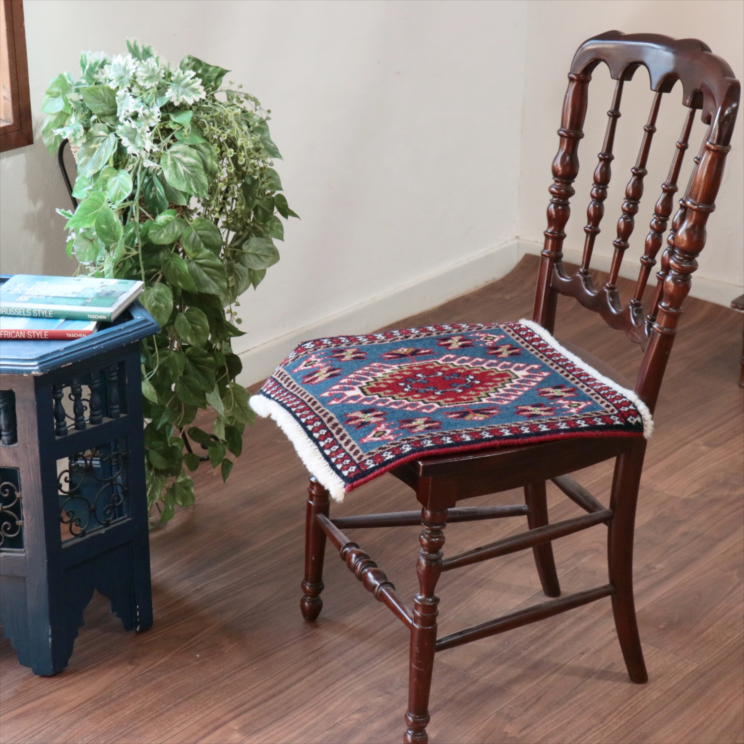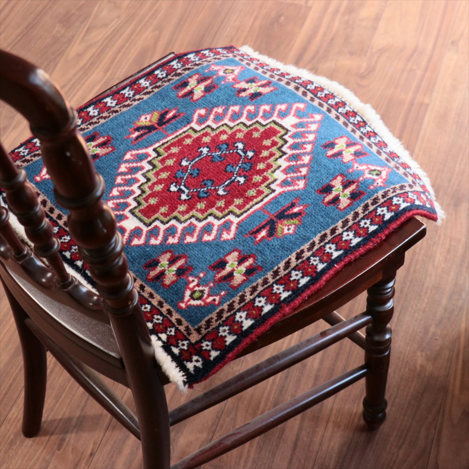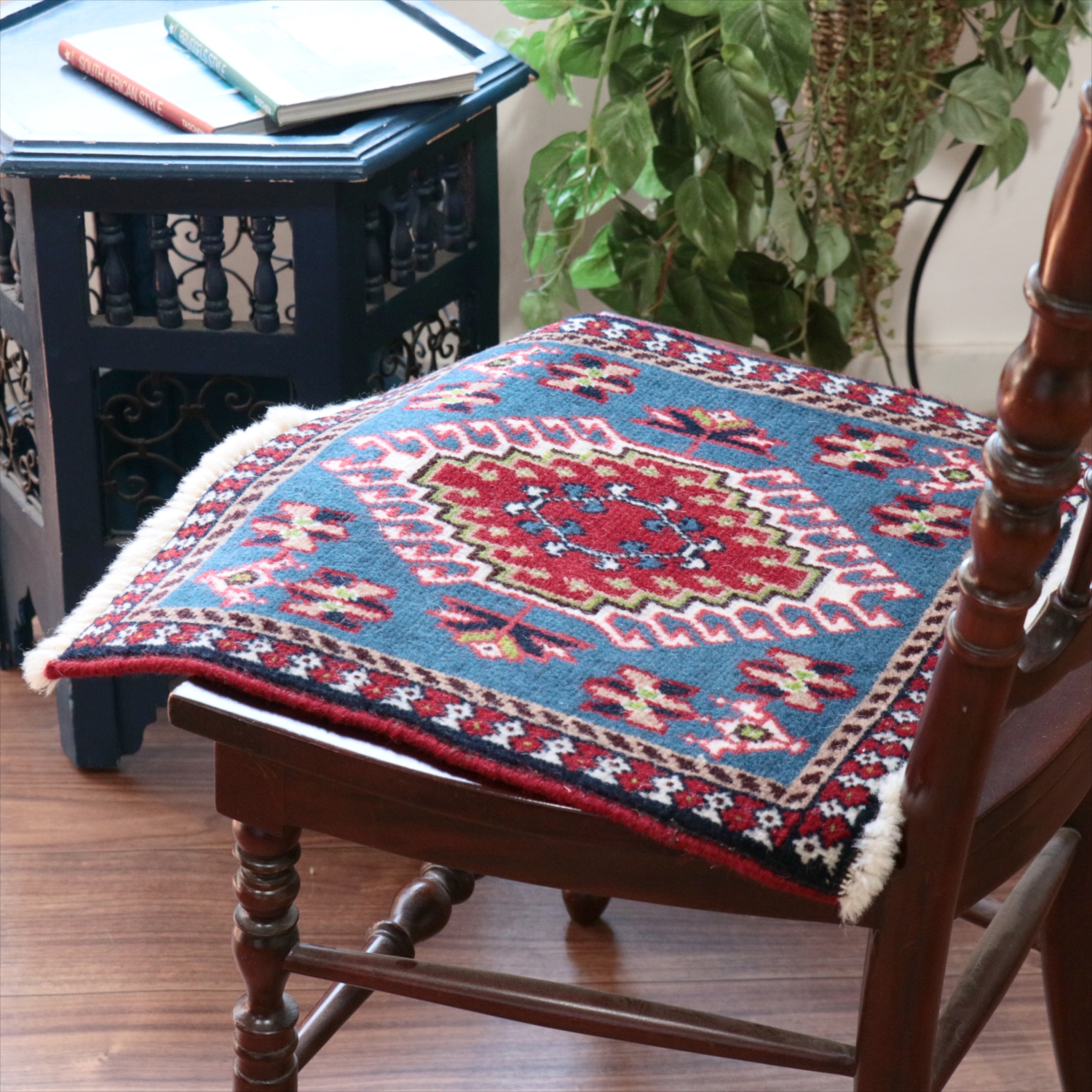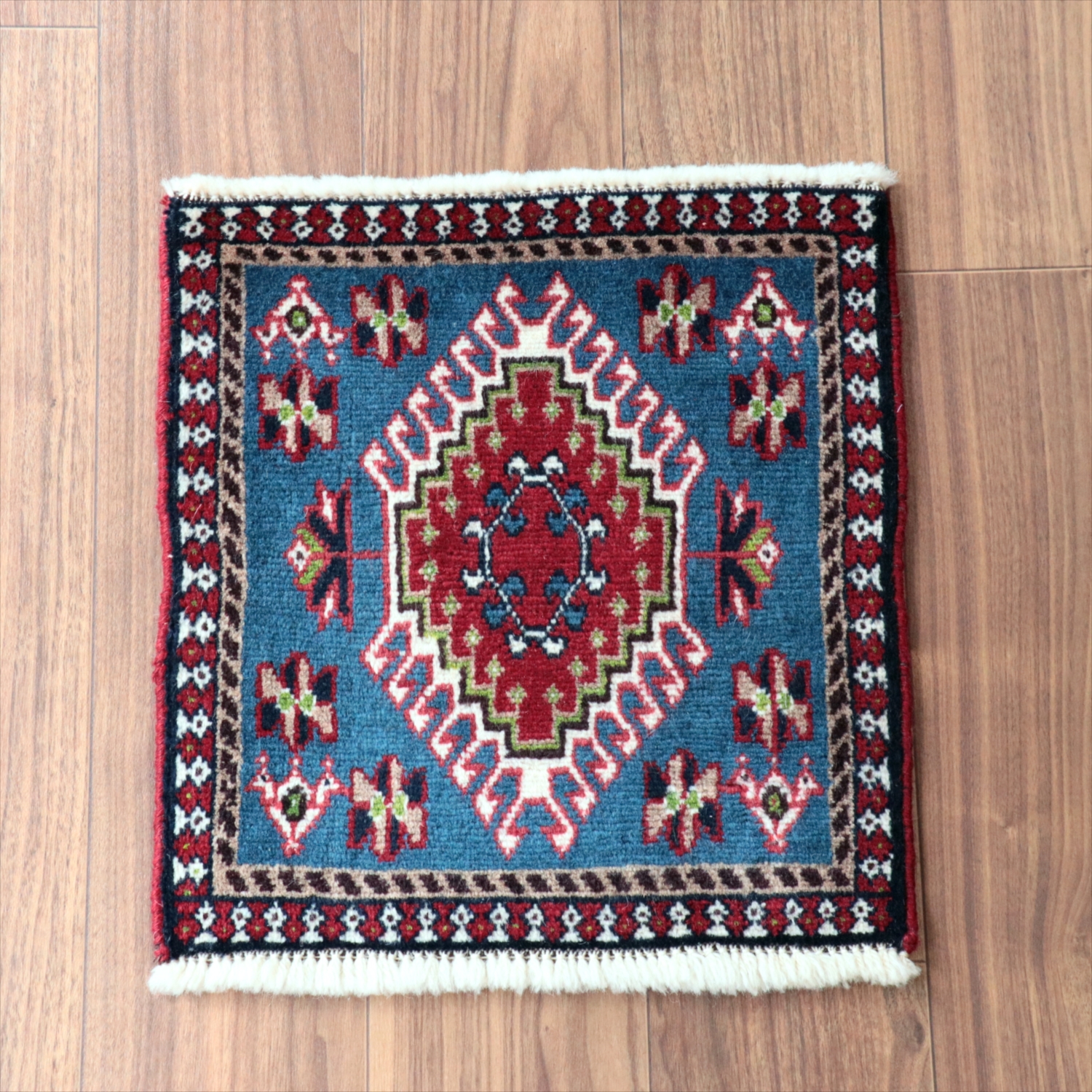 40cm角のミニサイズのラグ。小さいながらも、織りはしっかりしていて本格的です。多少ゆがみが気になりますが、ゆがみも含めて素朴な感じをお楽しみいただければと思います。