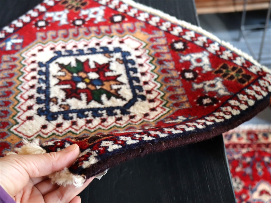 30cm角のミニサイズのラグ。小さいながらも、織りはしっかりしていて本格的です。多少ゆがみが気になりますが、ゆがみも含めて素朴な感じをお楽しみいただければと思います。