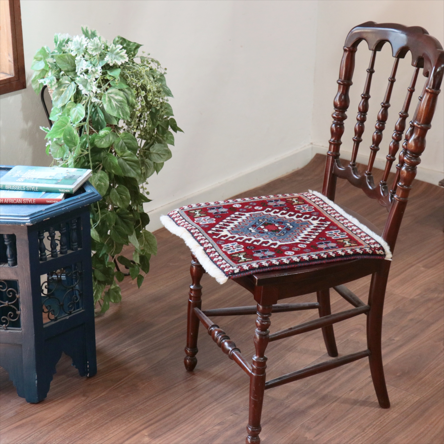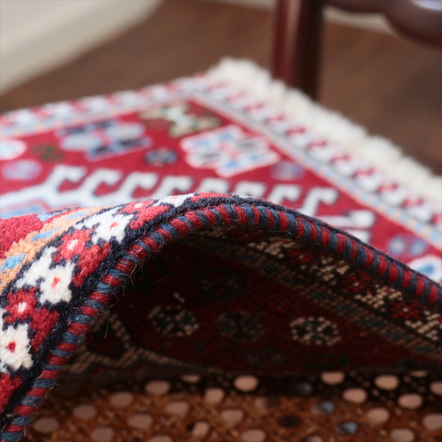 40cm角のミニサイズのラグ。小さいながらも、織りはしっかりしていて本格的です。多少ゆがみが気になりますが、ゆがみも含めて素朴な感じをお楽しみいただければと思います。