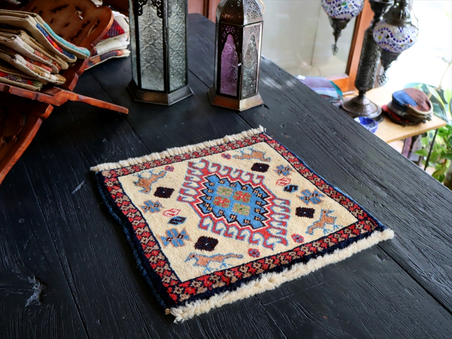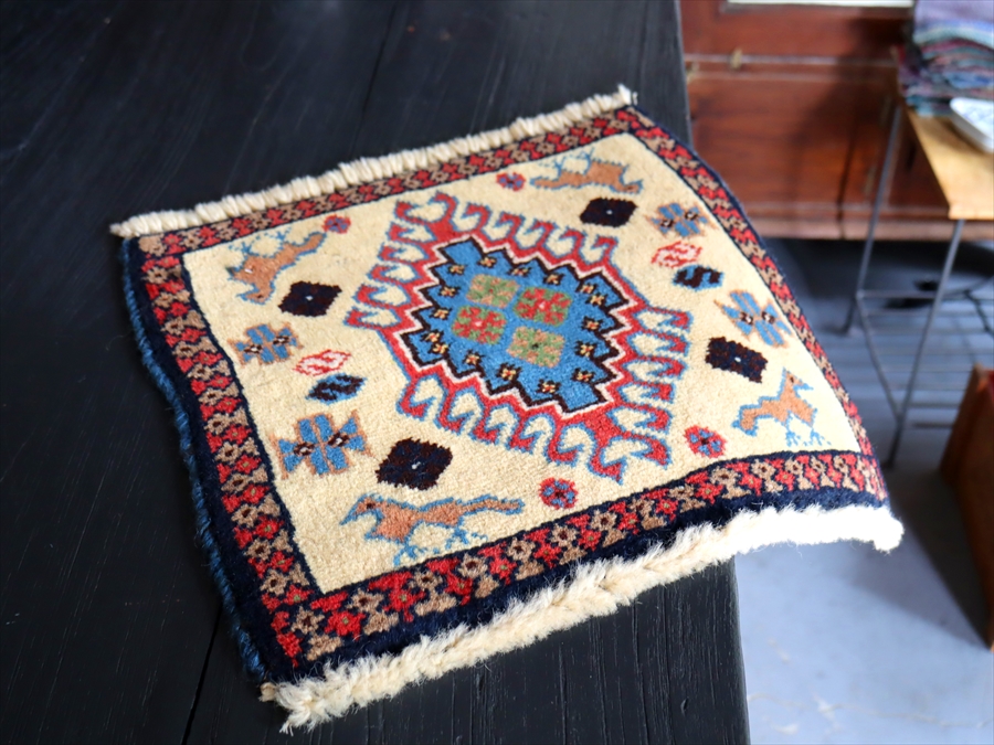 30cm角のミニサイズのラグ。小さいながらも、織りはしっかりしていて本格的です。多少ゆがみが気になりますが、ゆがみも含めて素朴な感じをお楽しみいただければと思います。