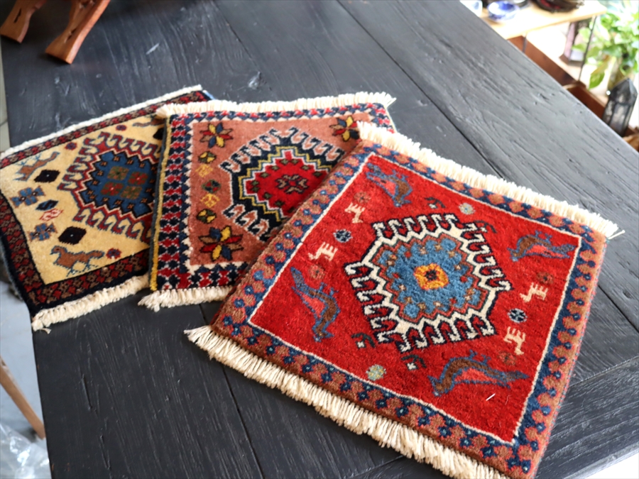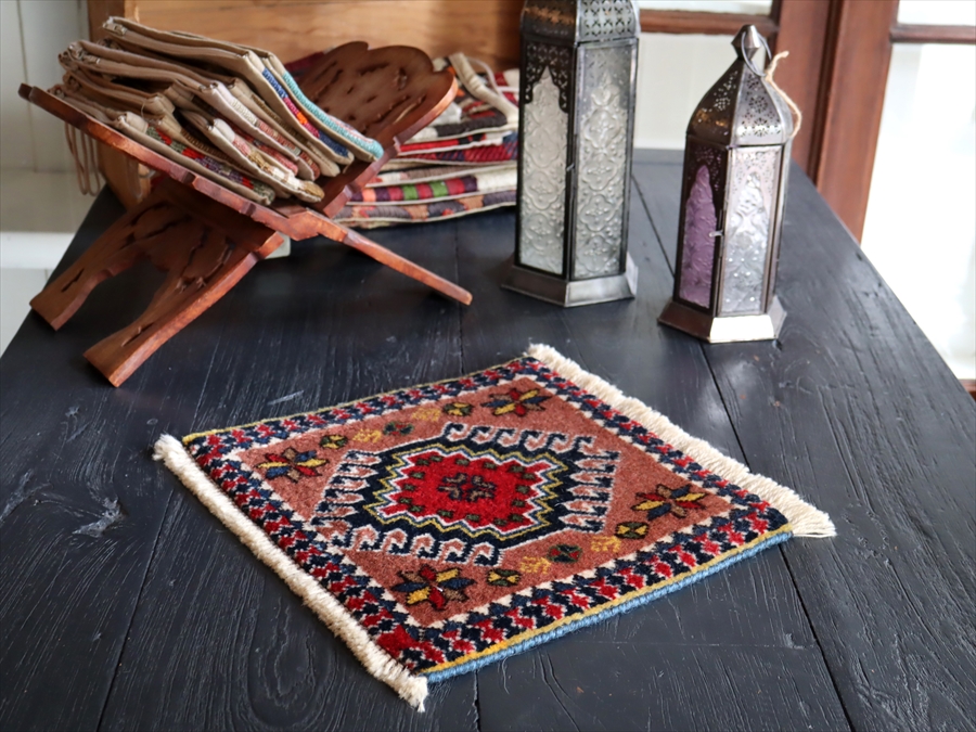 30cm角のミニサイズのラグ。小さいながらも、織りはしっかりしていて本格的です。多少ゆがみが気になりますが、ゆがみも含めて素朴な感じをお楽しみいただければと思います。