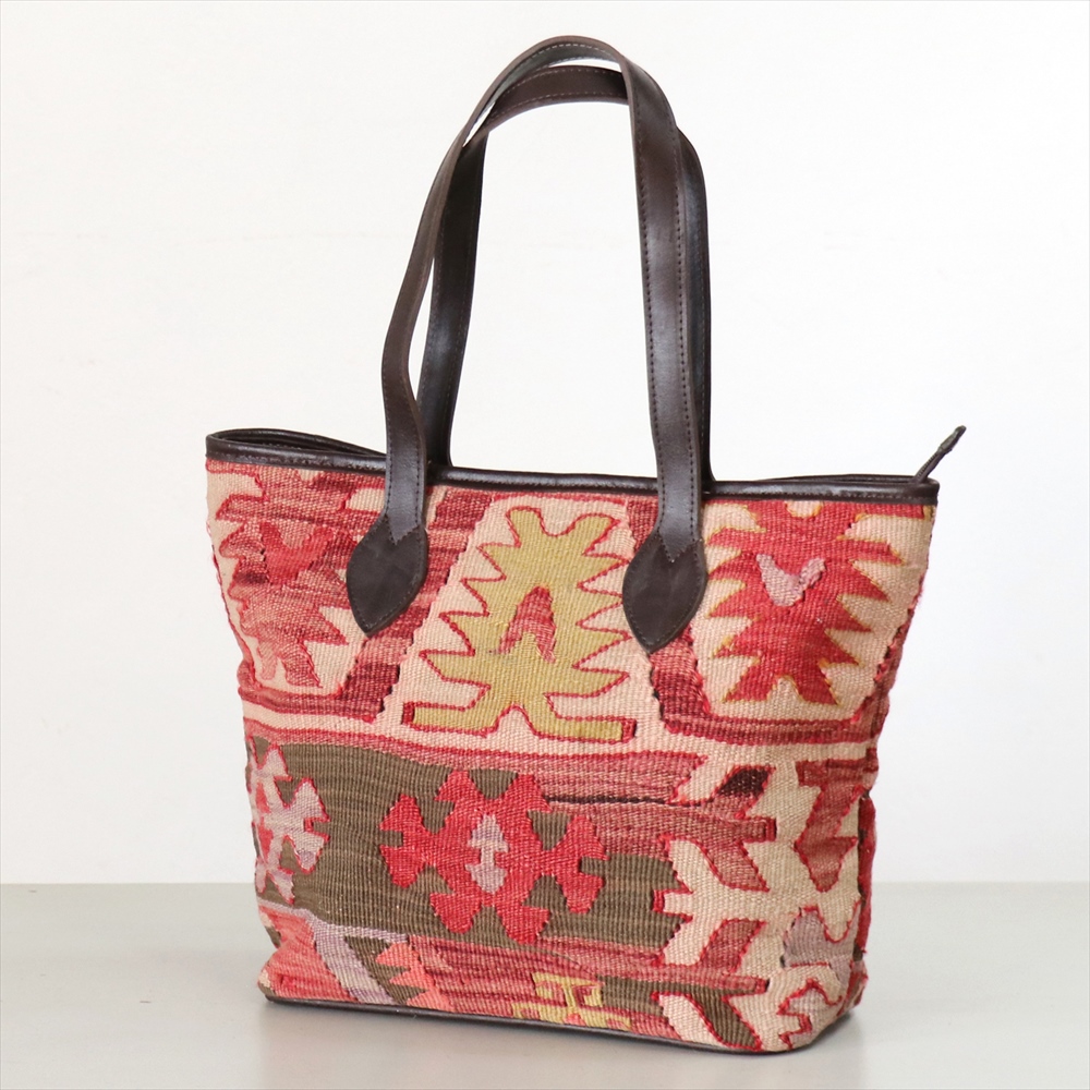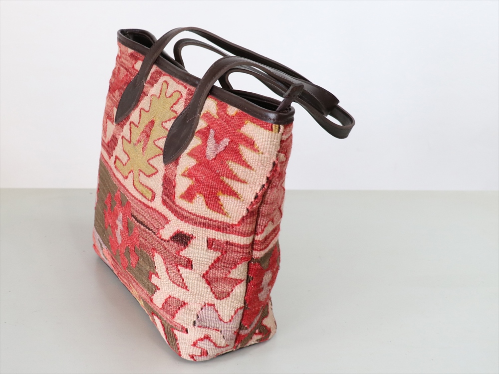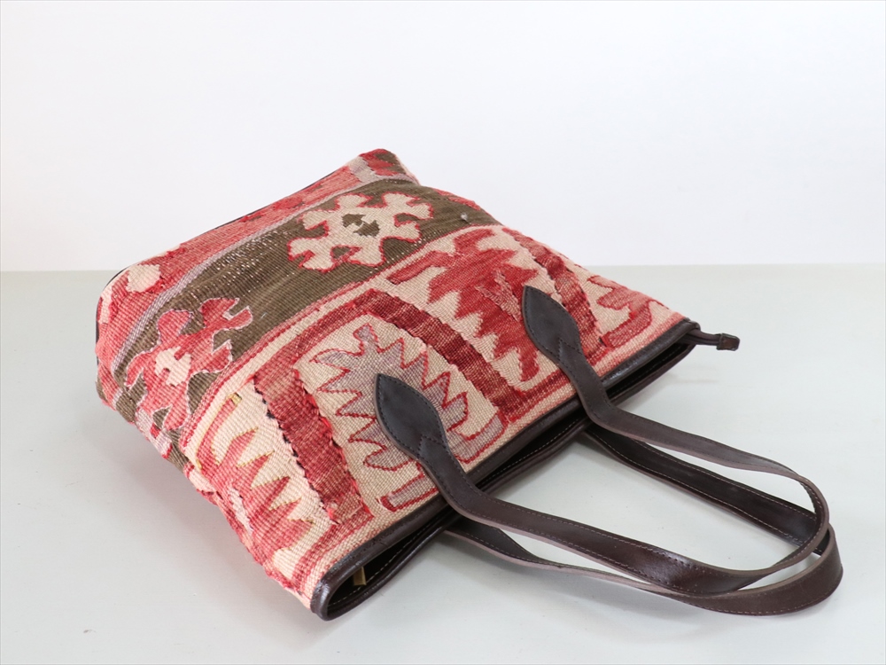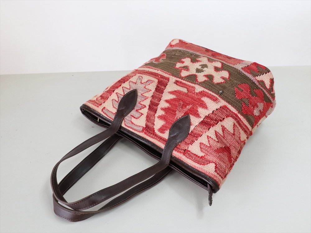 A4サイズが入るジッパー付きのショルダーバッグです。使われているキリムは、1950-60年代に、トルコ南部アダナ地方で織られた大型のチフカナットキリム。やや色あせが見られますが、年代を経たキリムらしい風合いが感じられます。