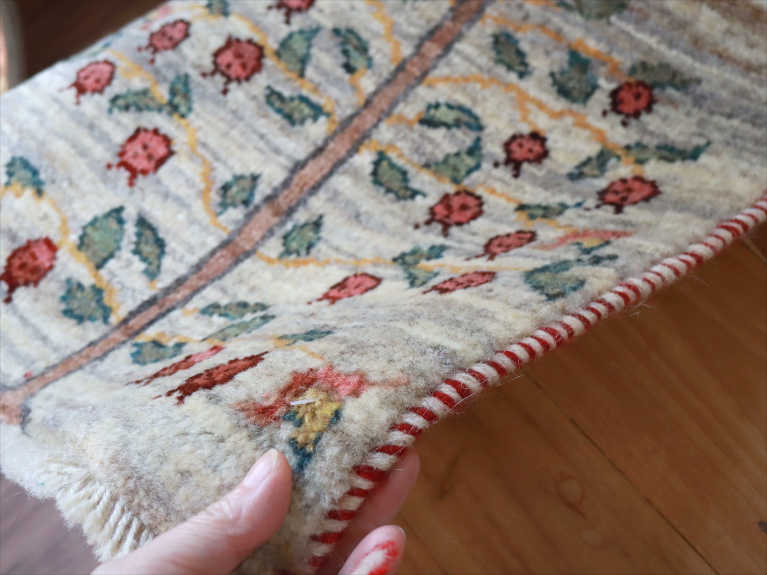 繊細な表現でモチーフが織り込まれた、細かな織り目のギャッベです。