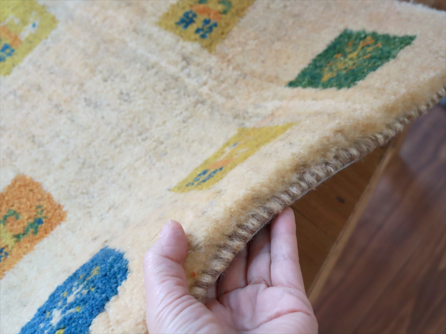 パイル(毛足)と下地を合わせた厚みは2.4-2.5cmほど。※アイボリー部分にオレンジっぽい染料がうつってしまっています。(別のギャベからうつった色)