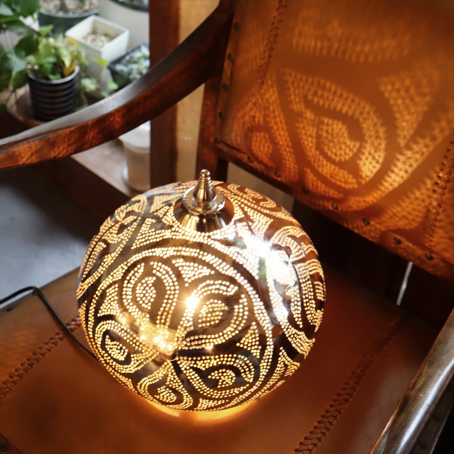 メタルを薄く加工し、コンコンと小さな穴をあけて光をデザインするランプシェードを作りました。中世から作られて来た伝統的な技法で、細工からこぼれる光が壁に映り、エキゾチックな雰囲気を楽しめます。