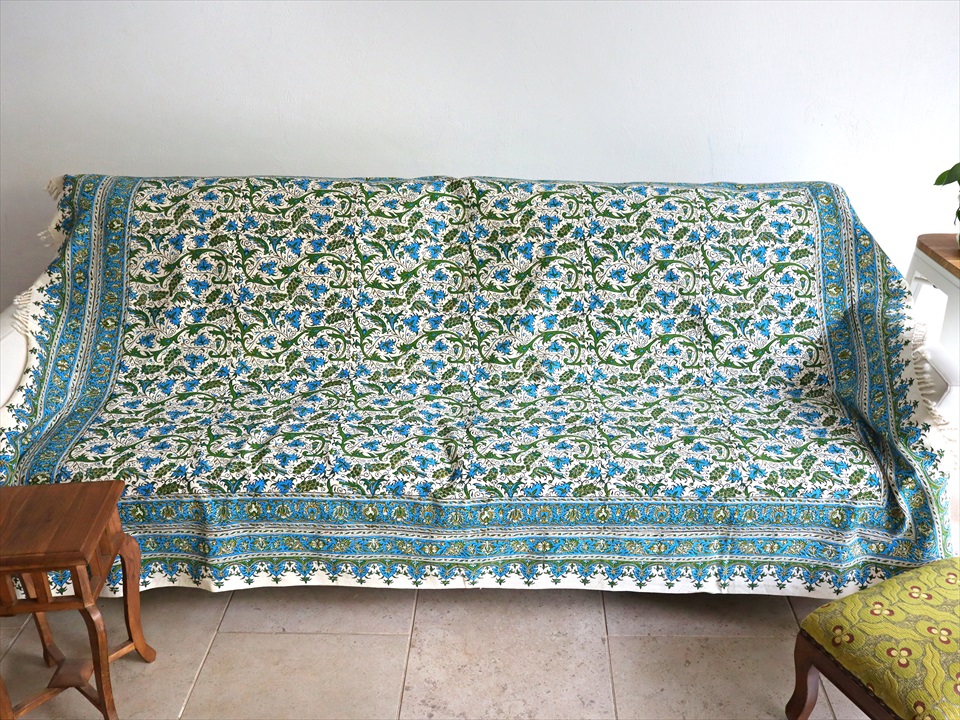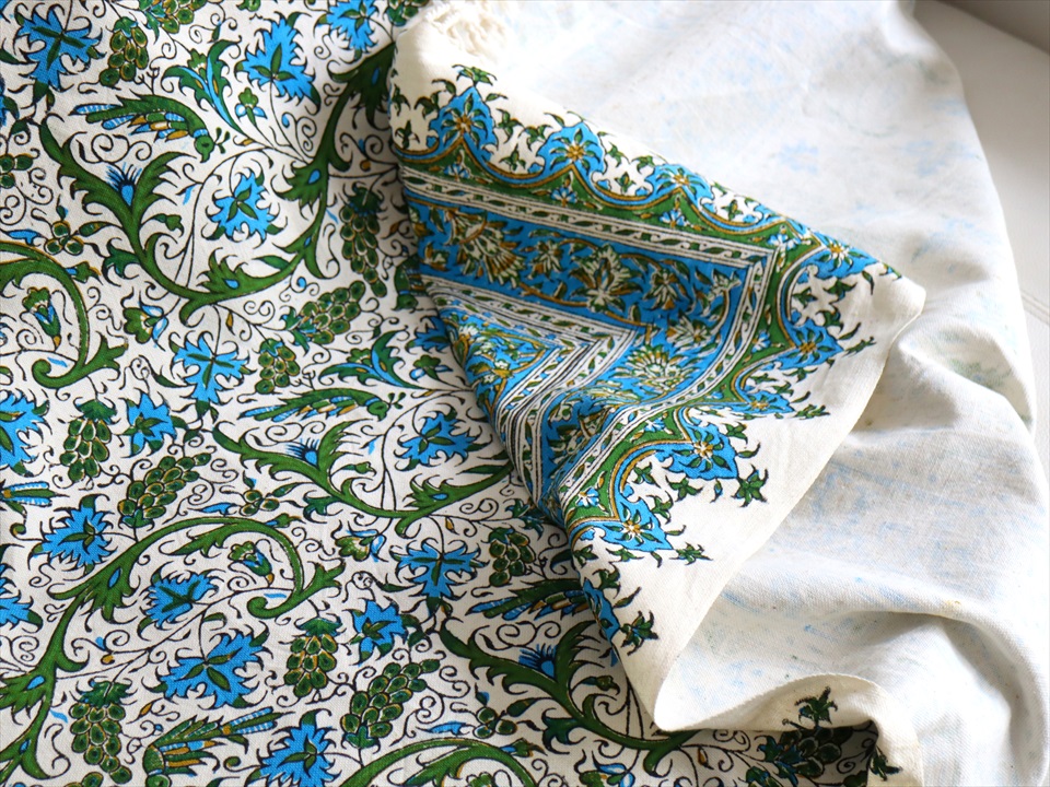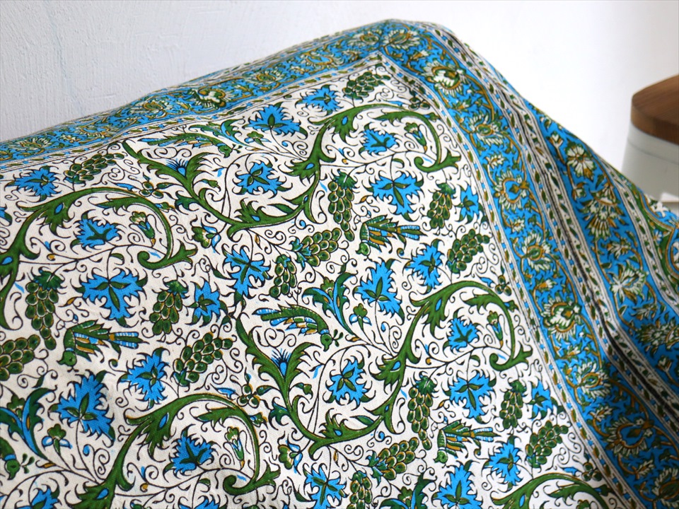 【15%OFF】ペルシャ更紗 イラン手染め布 204x132cm ブルー系 葡萄柄 テーブルクロス ソファカバー