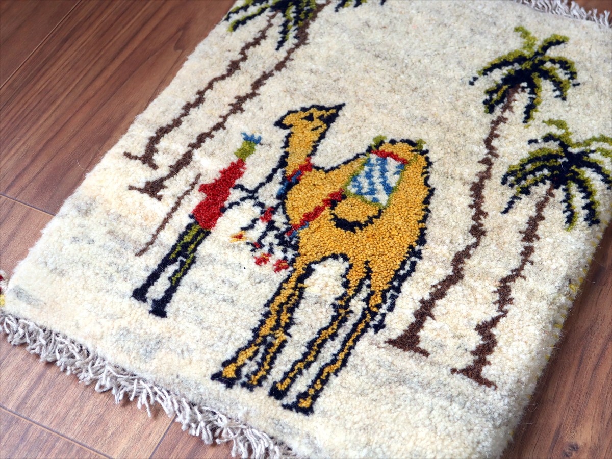 - 【15%OFF】ギャッベ イラン産手織り 座布団サイズ 45×39cm ナチュラルアイボリー ラクダと遊牧民