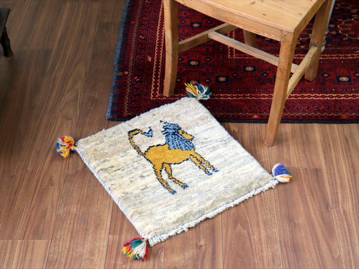 - 【15%OFF】ギャッベ イラン産手織り 座布団サイズ 43×42cm ナチュラルアイボリー ブルーのたてがみを持つライオン