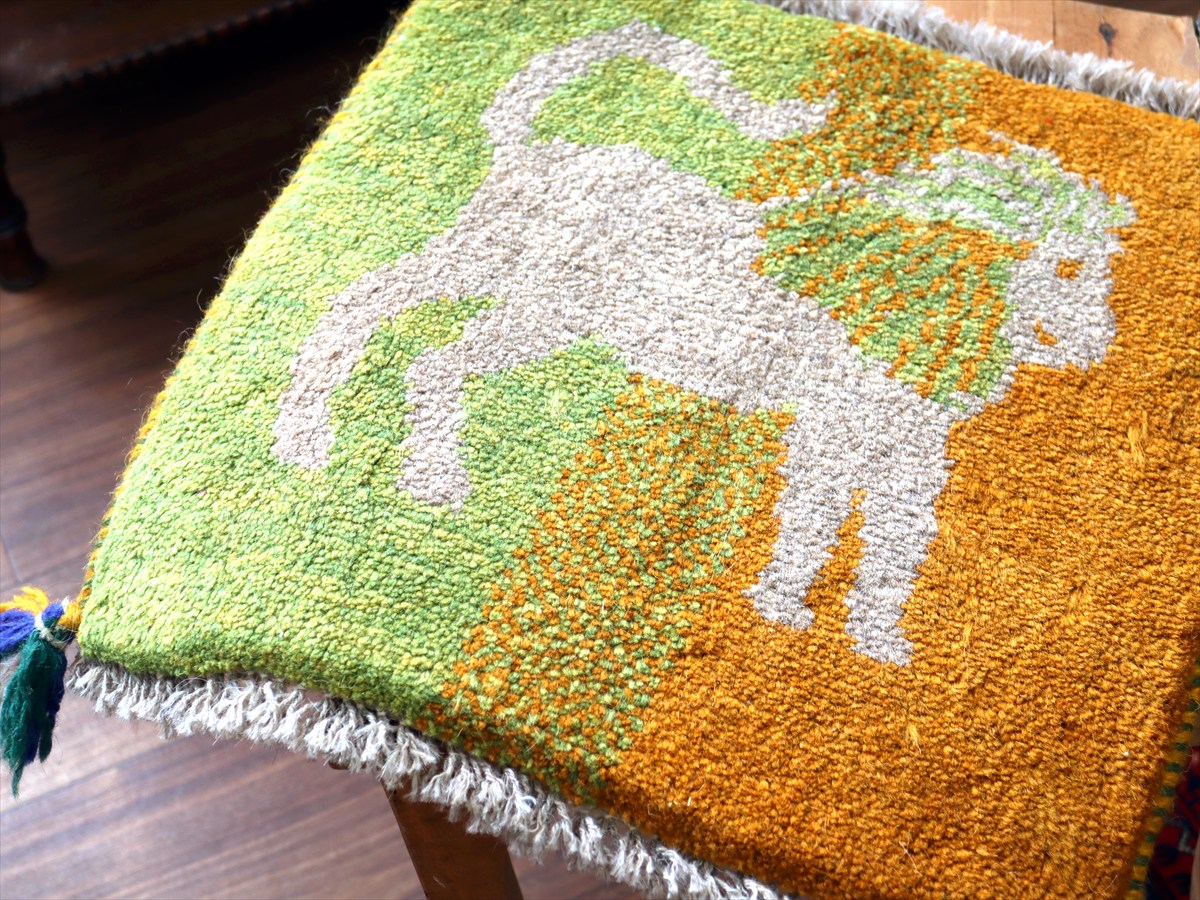 【15%OFF】ギャッベ イラン産手織り 座布団サイズ 40×38cm グリーン&イエロー ライオン