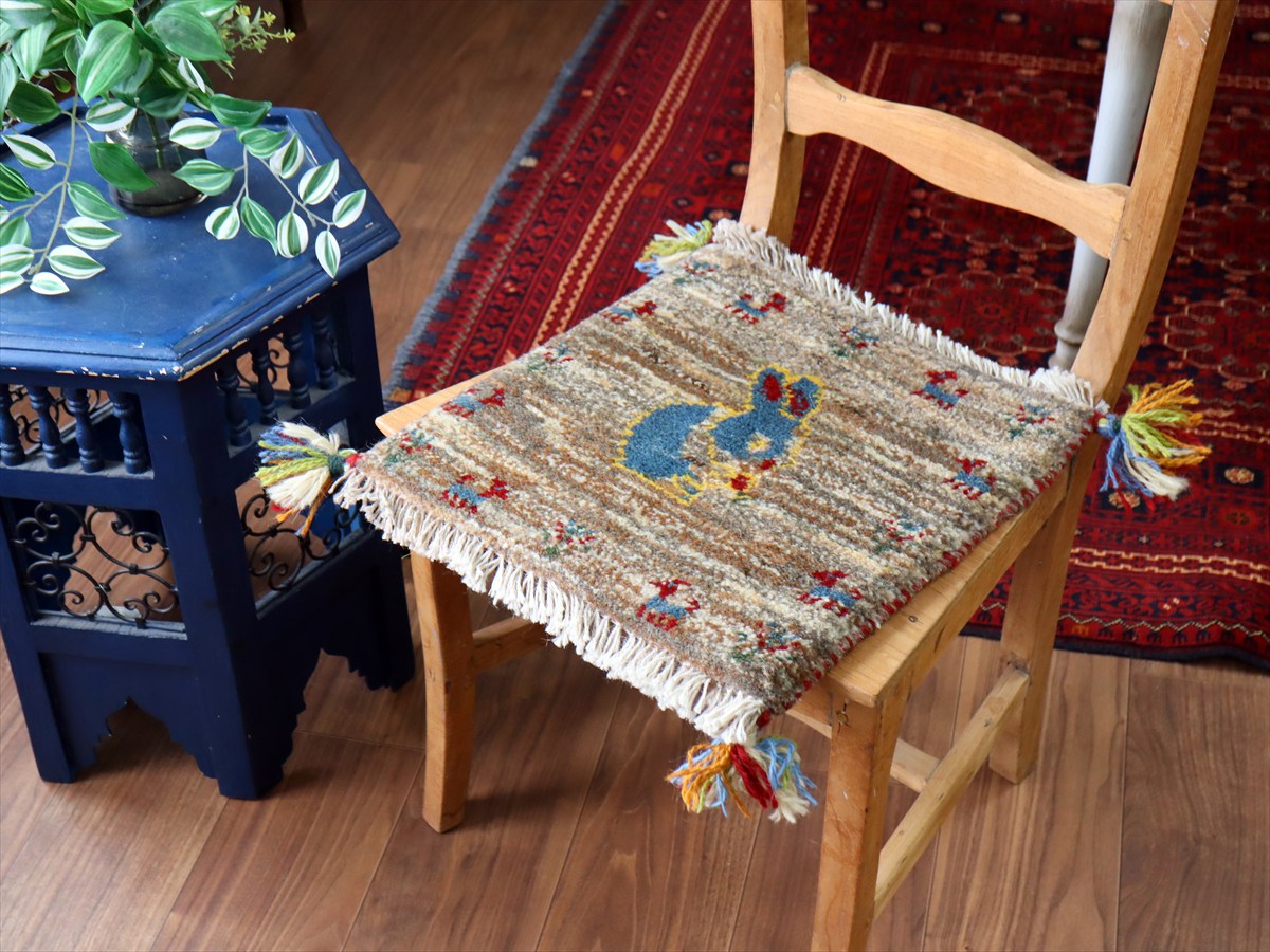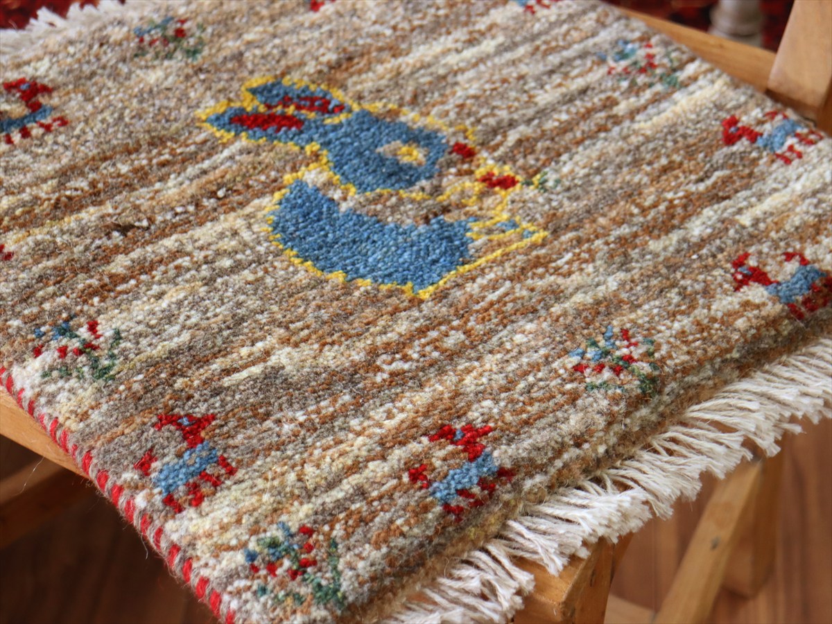 【15%OFF】ギャッベ イラン産手織り 座布団サイズ 39×37cm ナチュラルブラウングレー 草をはむうさぎ