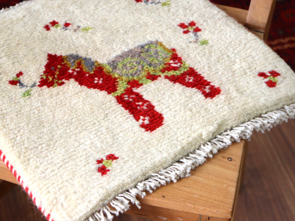 【15%OFF】ギャッベ イラン産手織り 座布団サイズ 37×38cm ナチュラルアイボリー フラワーと馬