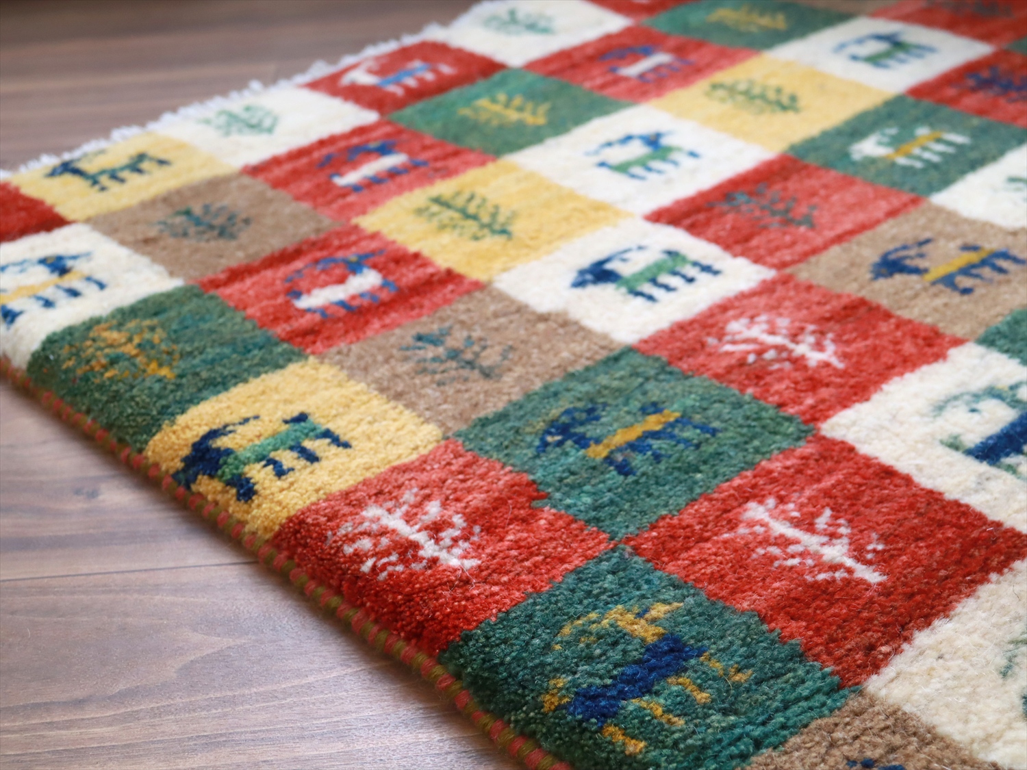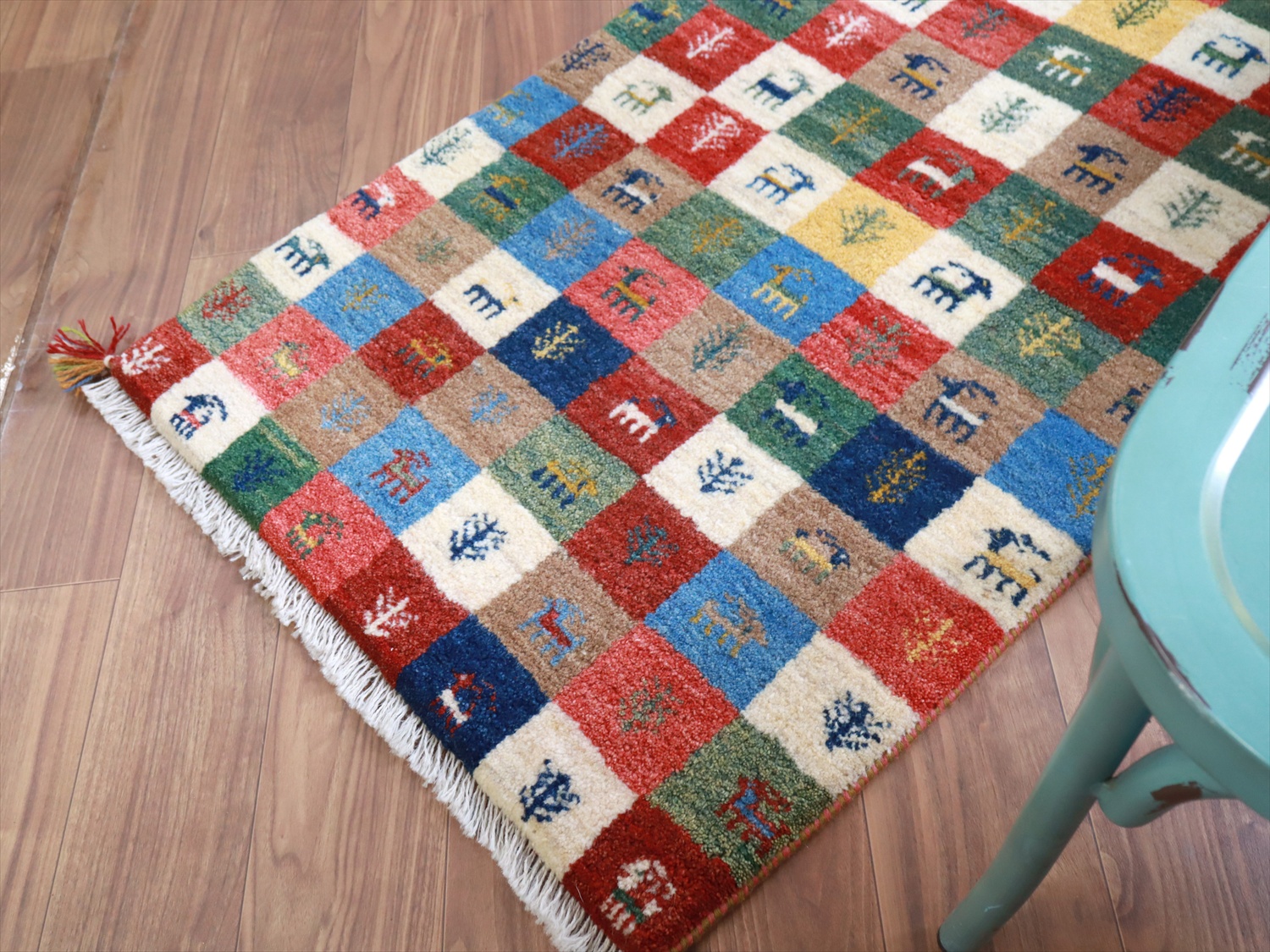 モダンなデザインに見えますが、カラフルなタイル柄もカシュカイ族の伝統柄のひとつ。タイルの配色が、向かって上半分と下半分で異なっているのがユニークです。小さな動物や草花のモチーフのひとつひとつに個性があって、見ていて楽しいギャッベです。