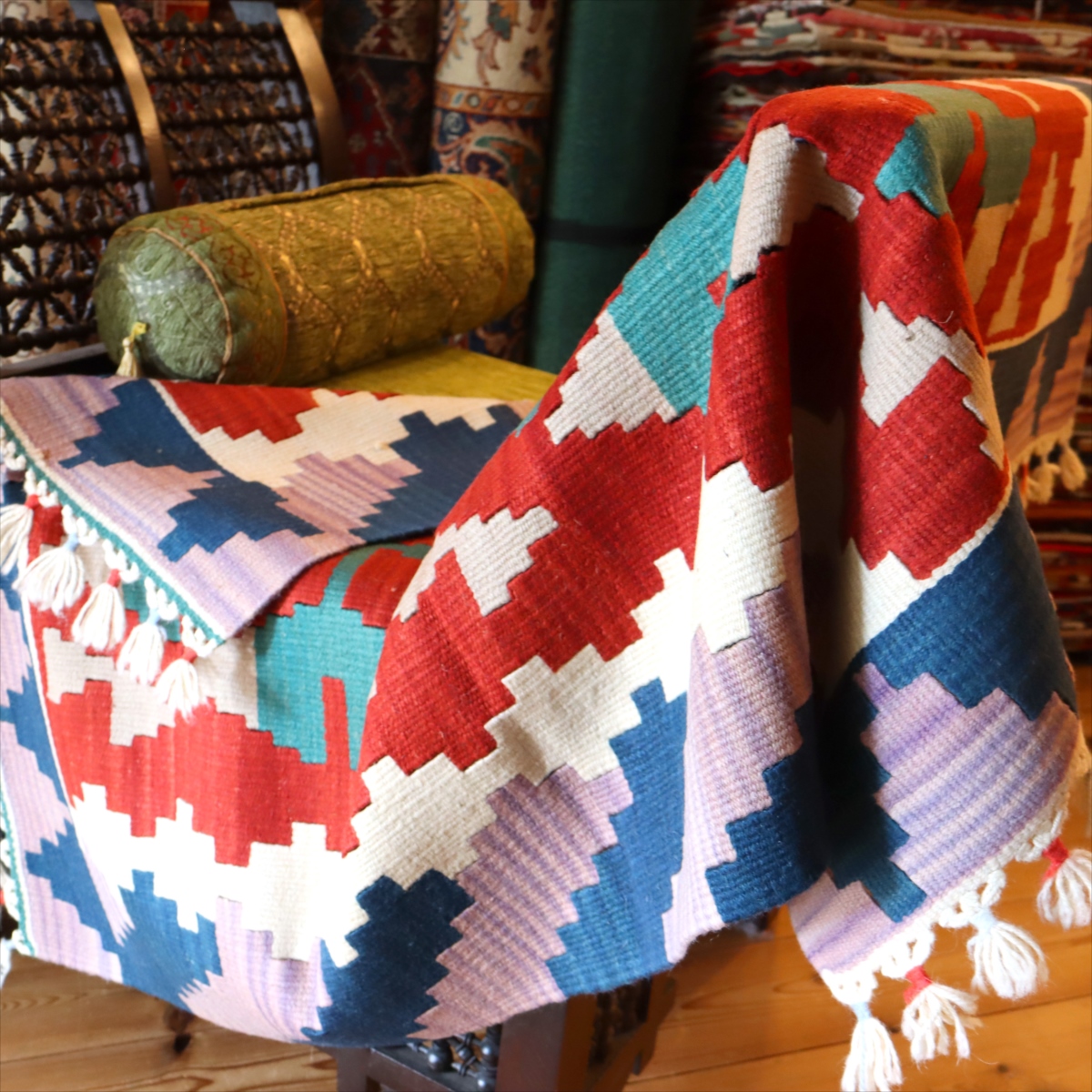 織り地がしなやかでやわらかいのがカイセリキリムの特徴です。やや厚みがあり、やさしい肌触り。色の切り替え部分には、キリムの織りの特徴で、縦に隙間が開いています(スリットと呼んでいます)。