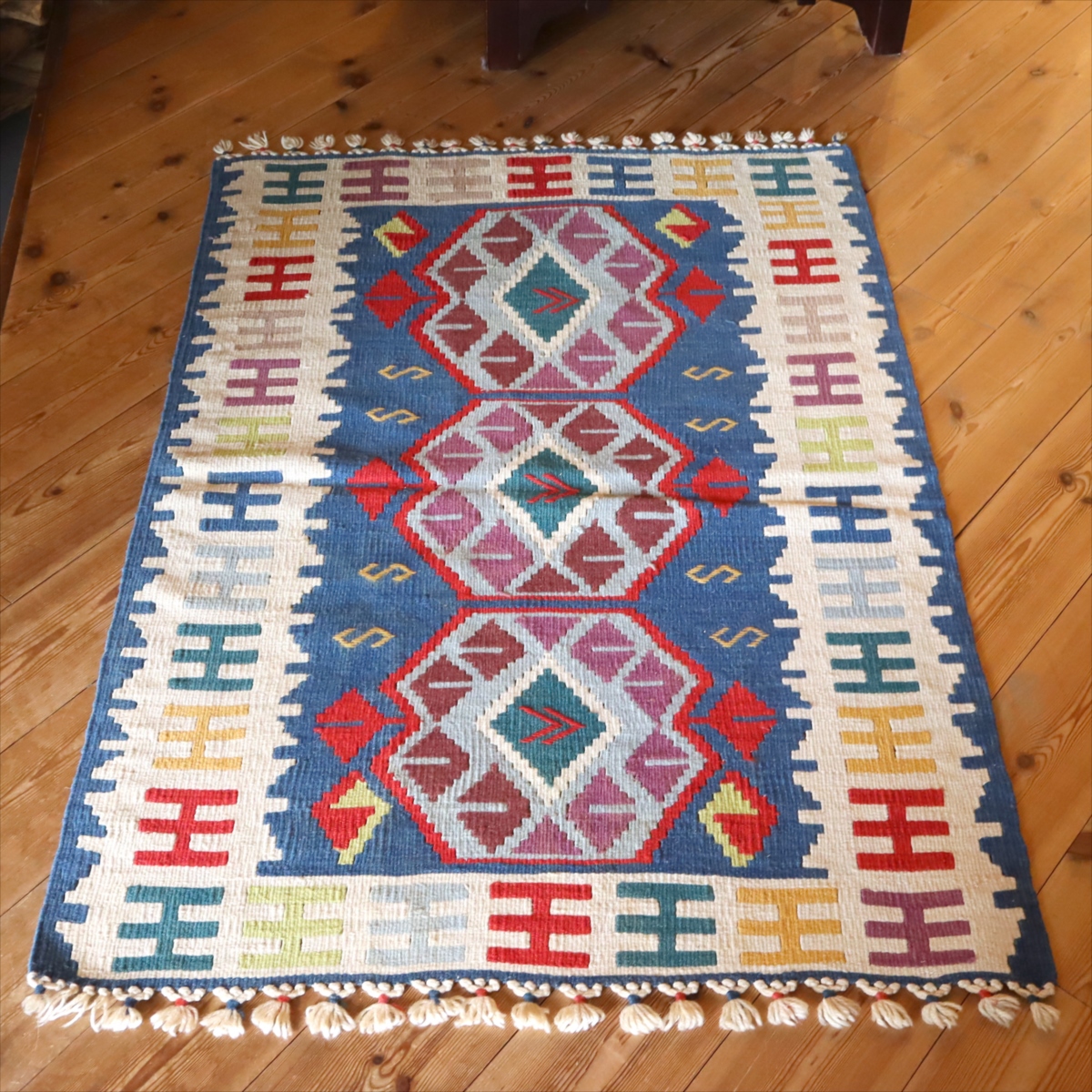 トルコキリムらしい伝統的なスタイルで織られているカイセリ産のキリムです。カイセリ地方は、トルコの中央部、カッパドキアに近く、古い時代から多くの諸品が集まり、現在でも絨毯やキリム産業の中心となっています。工業製品にはないあたたかさがあり、我が家のキリムとして愛着の持てる一枚になってくれます。