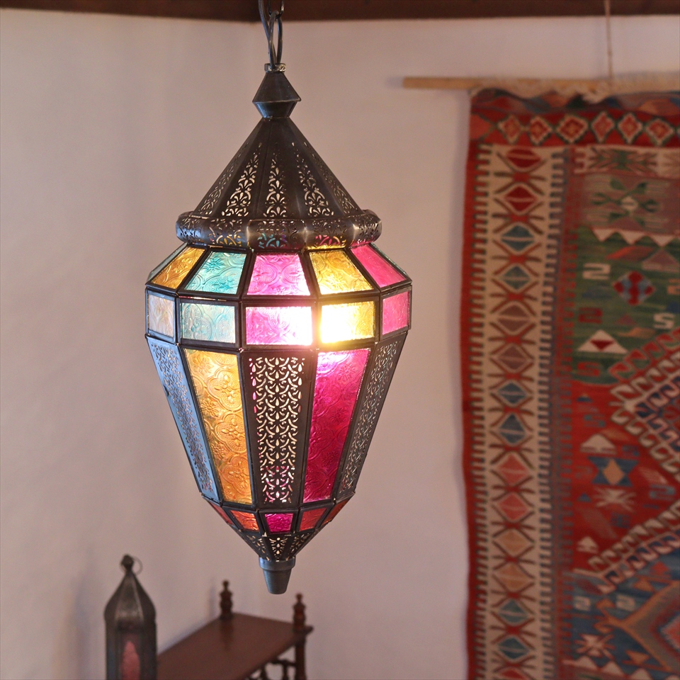 - 【10%OFF】モロッコランプ ガラスペンダントライト 多面体形ランプ 全高80cm 直径21cm マルチカラー 多面体のレリーフガラス