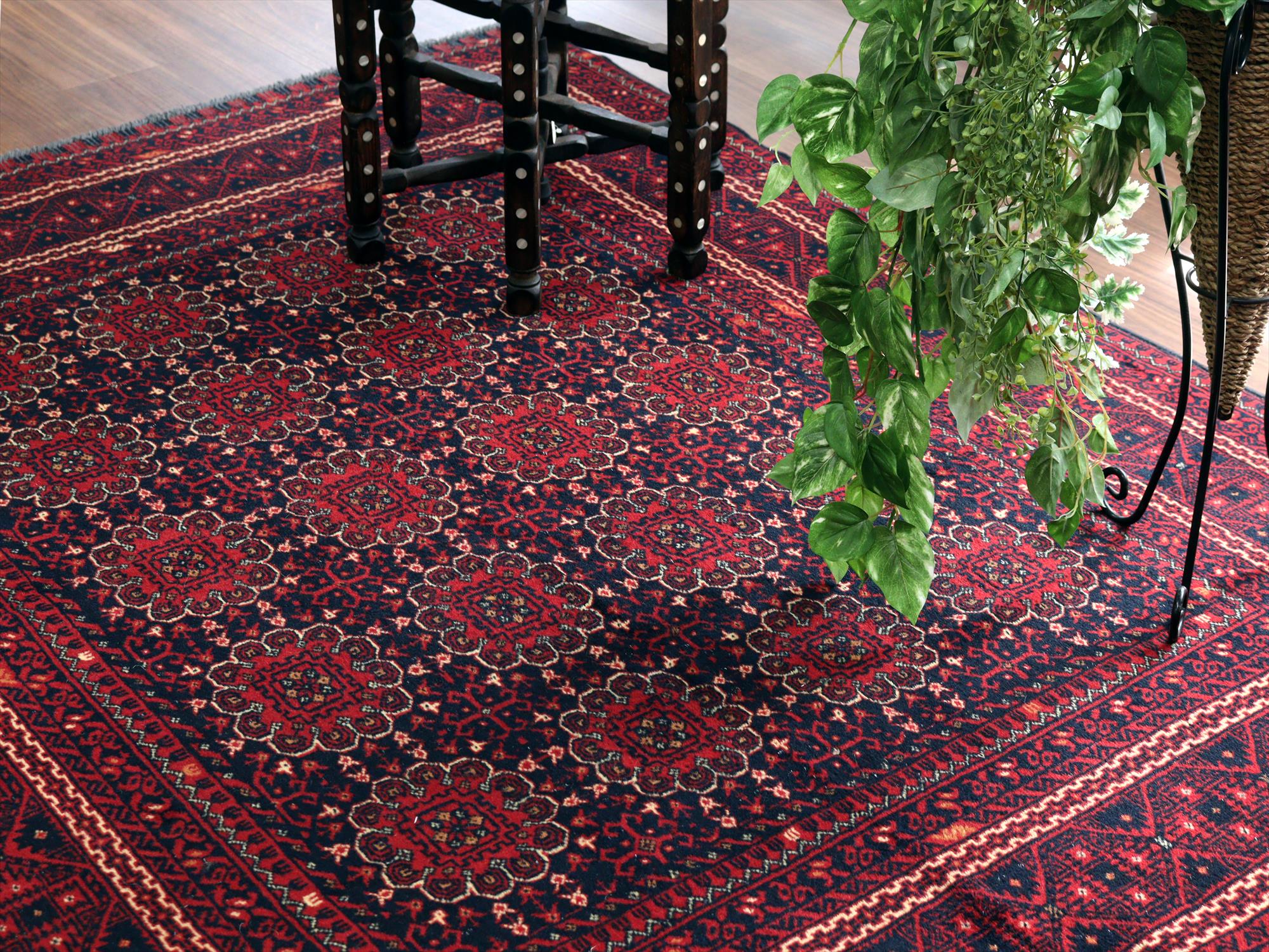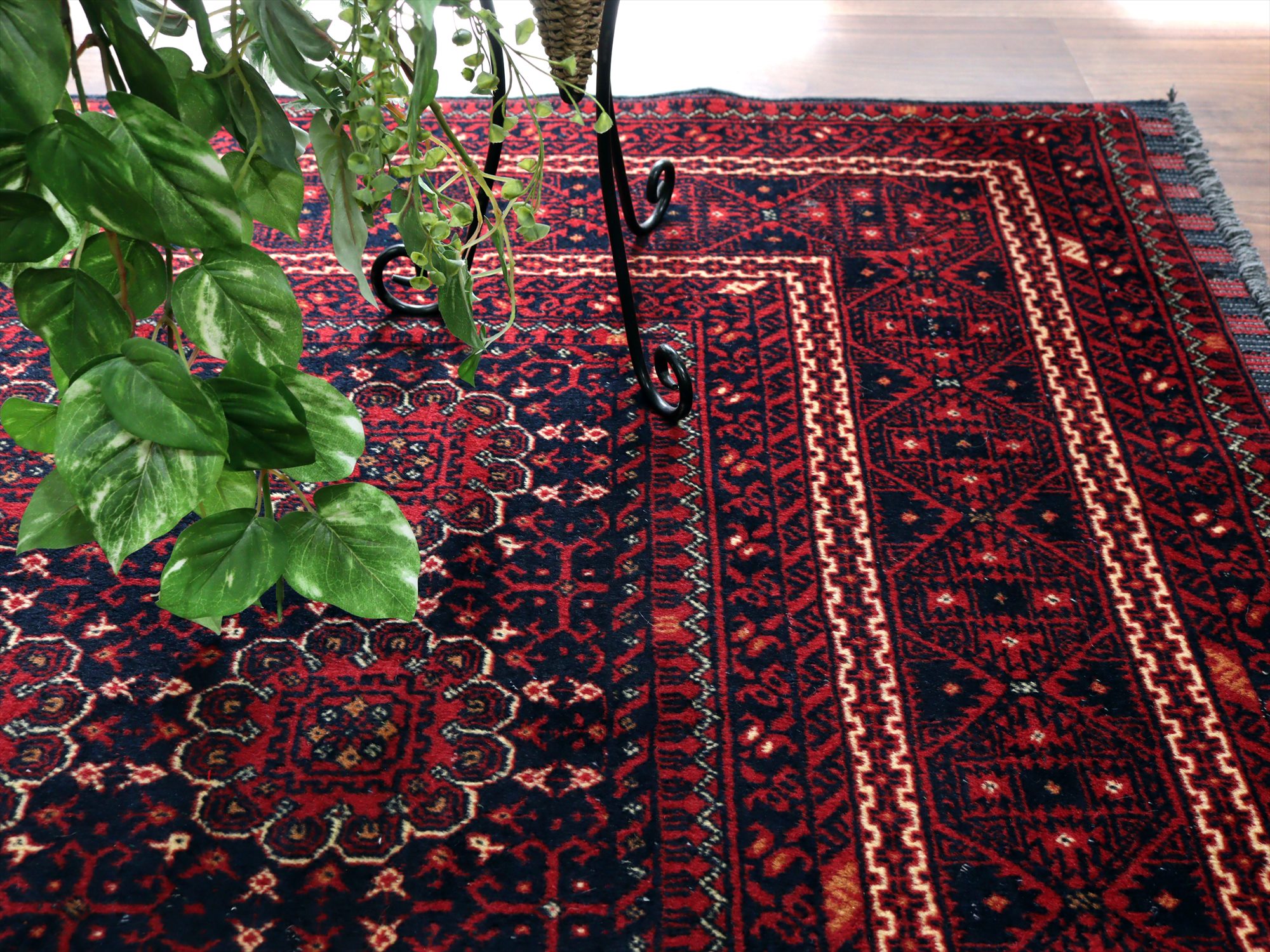 光沢のあるビロードのような、滑らかでツヤのある細かな織りの、アフガニスタン北部・クンドゥズ地方で織られた高級絨毯です。トルコのイスタンブールにおいても、ツーリストに大変人気があります。色はとても深い赤で、黒色に見える濃紺との相性は抜群です。
