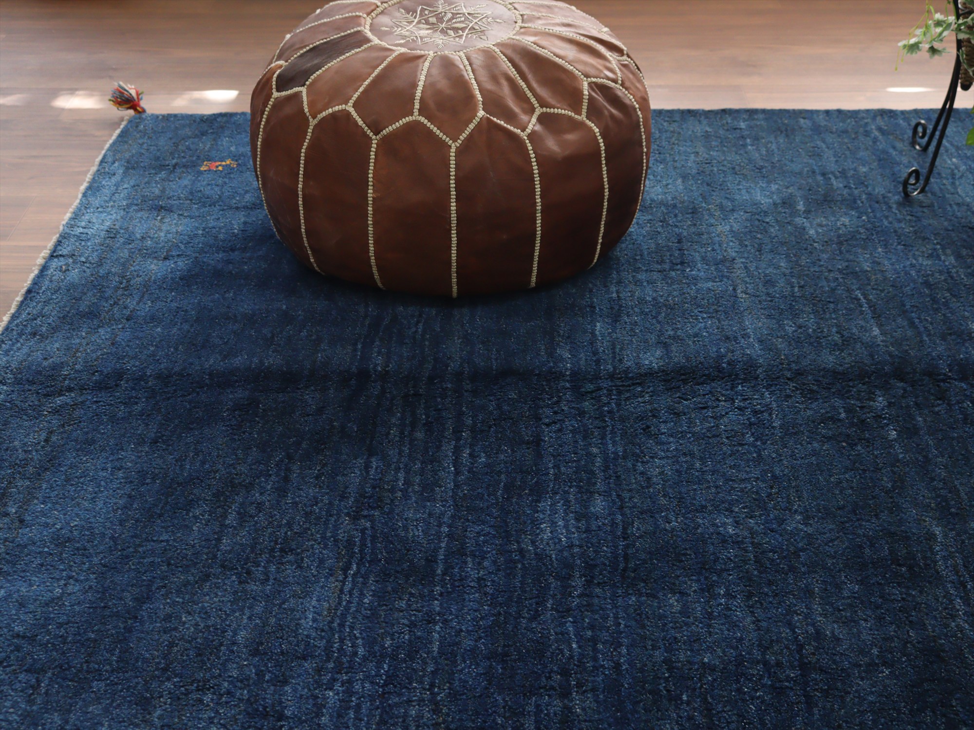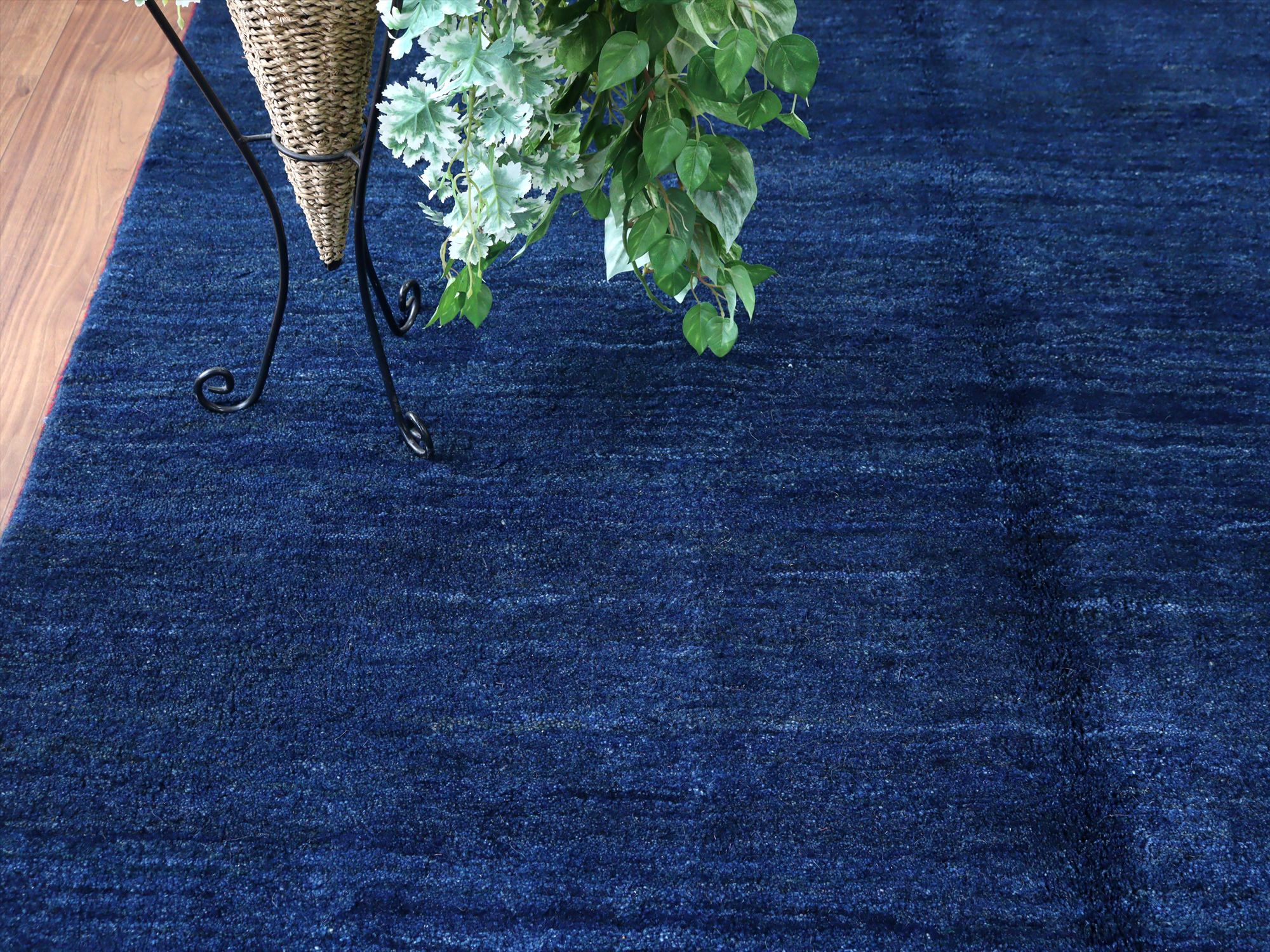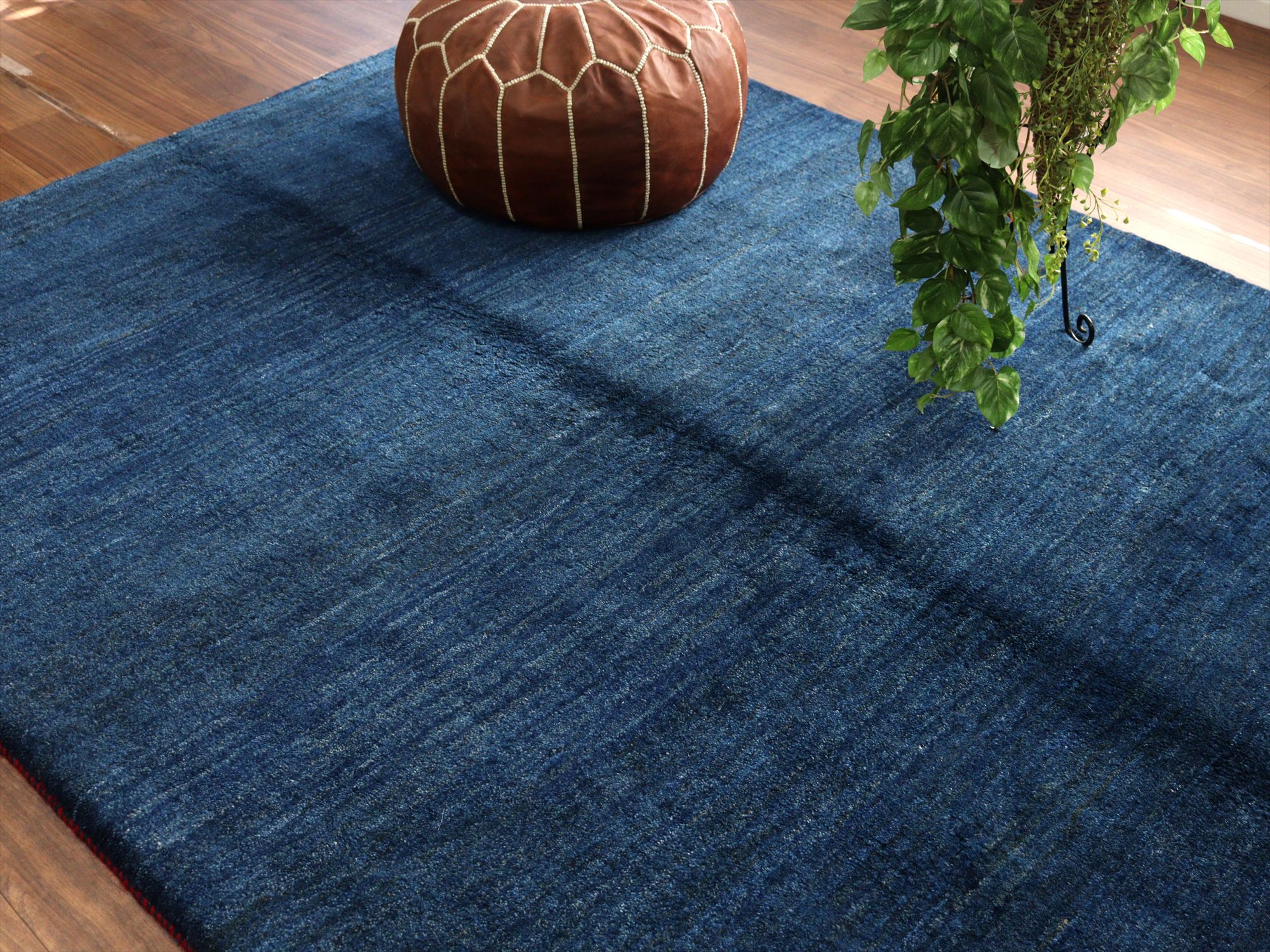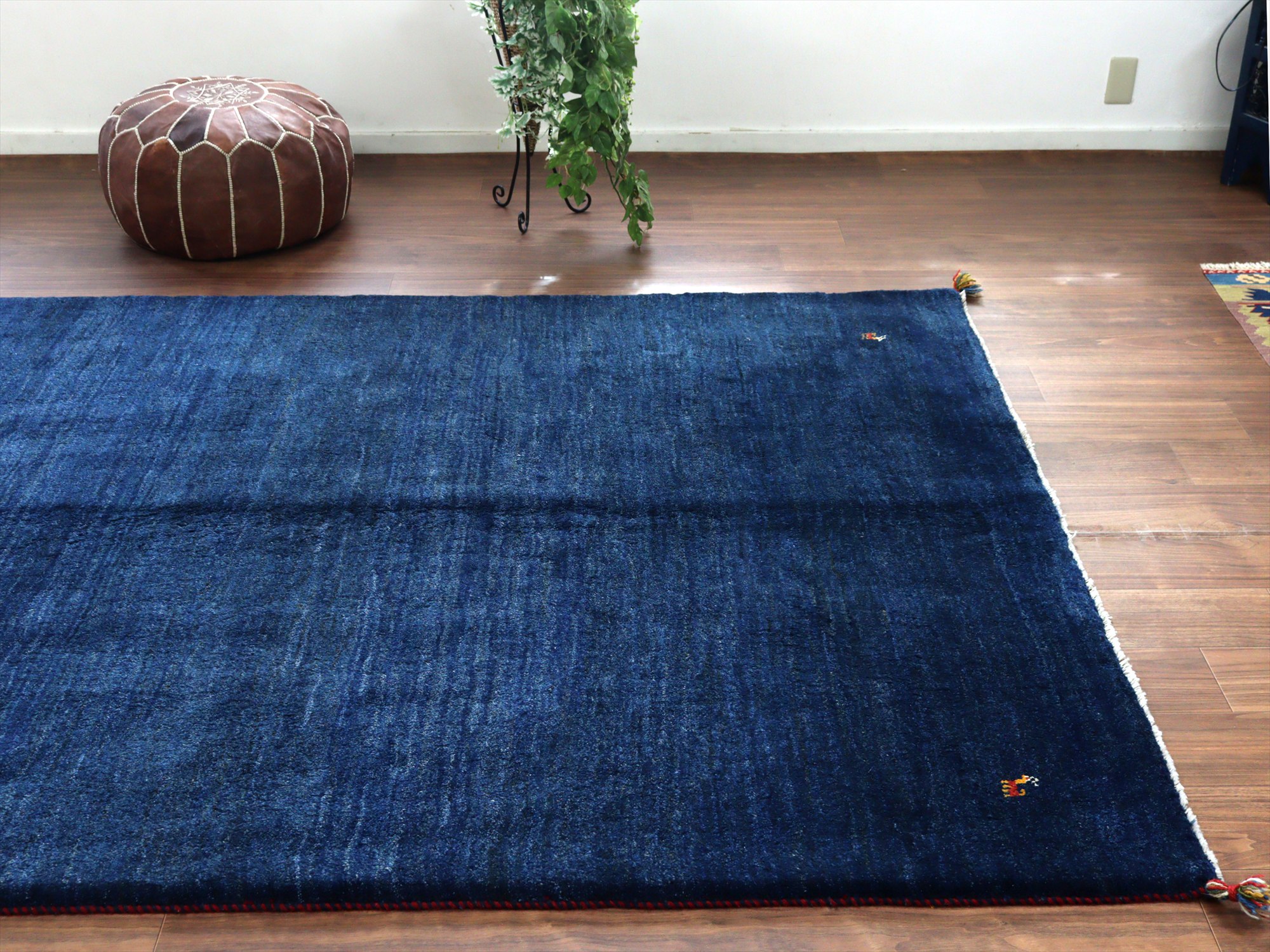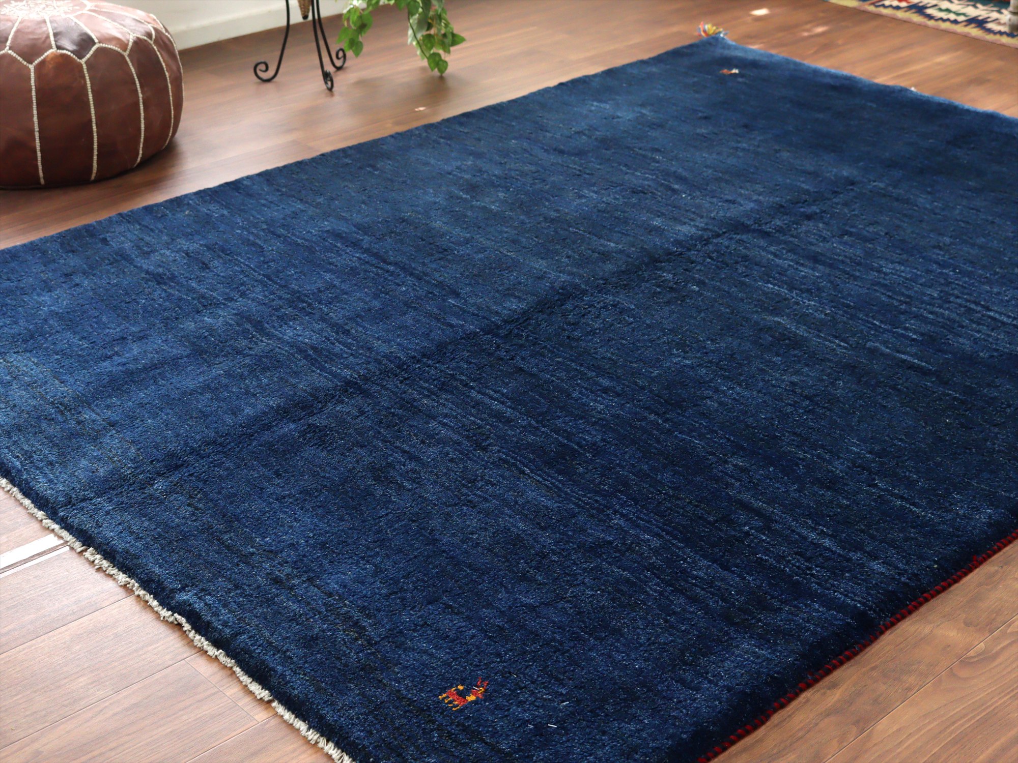 深いネイビーのギャッベ。染めが均一でないため、濃淡のグラデーションがナチュラルに出ていて美しいです。四隅に動物が織られたシンプルなデザイン。