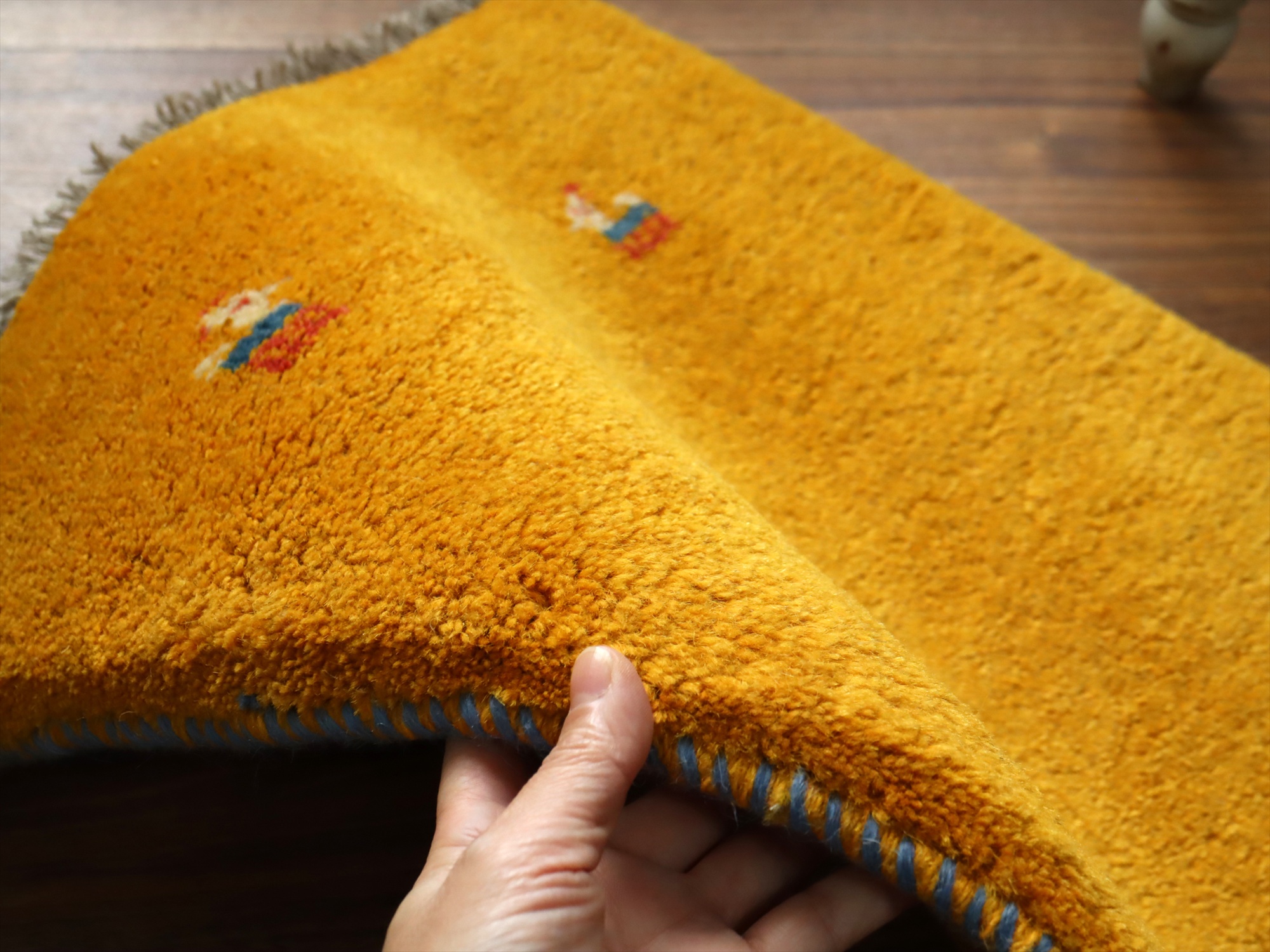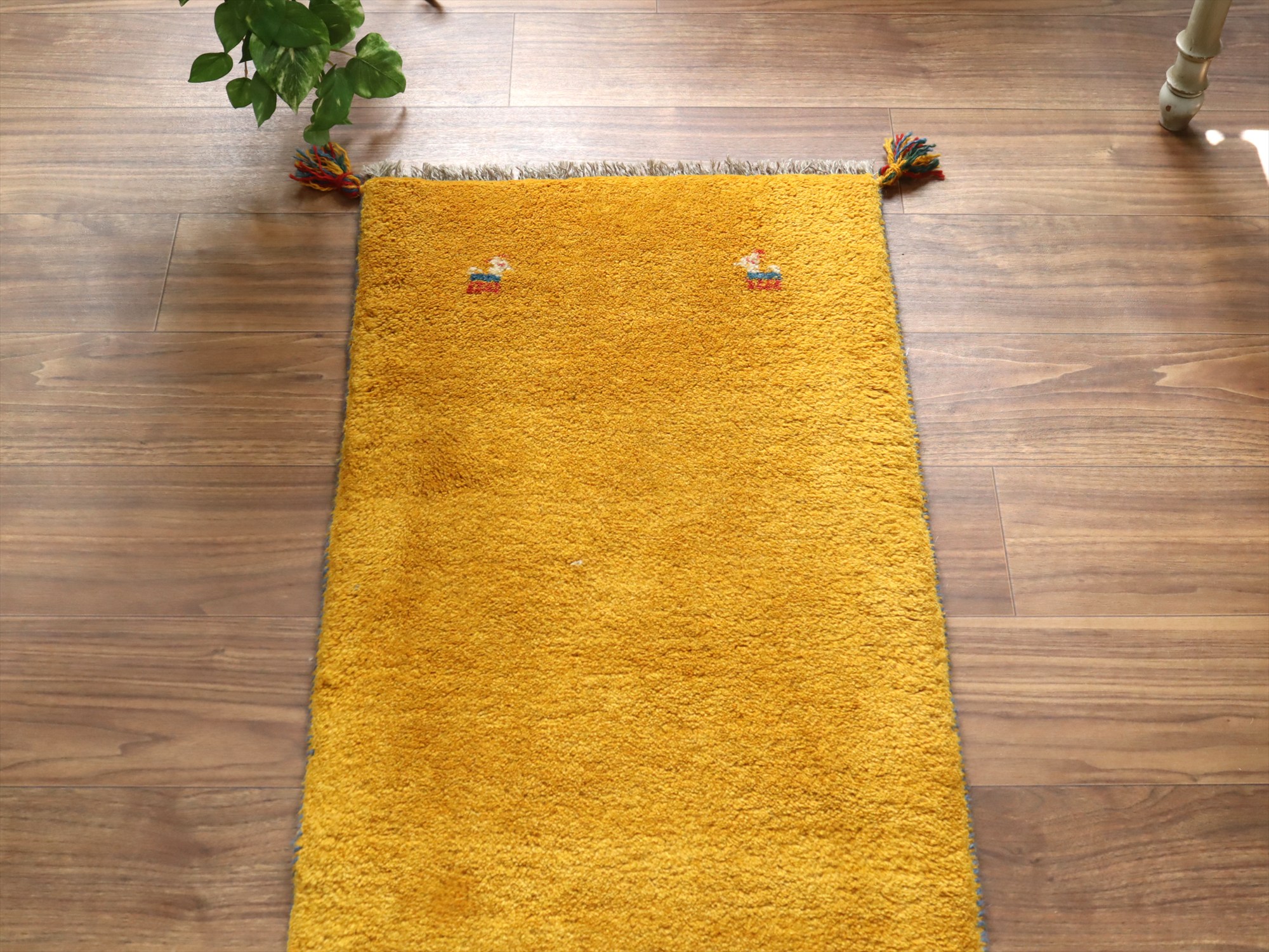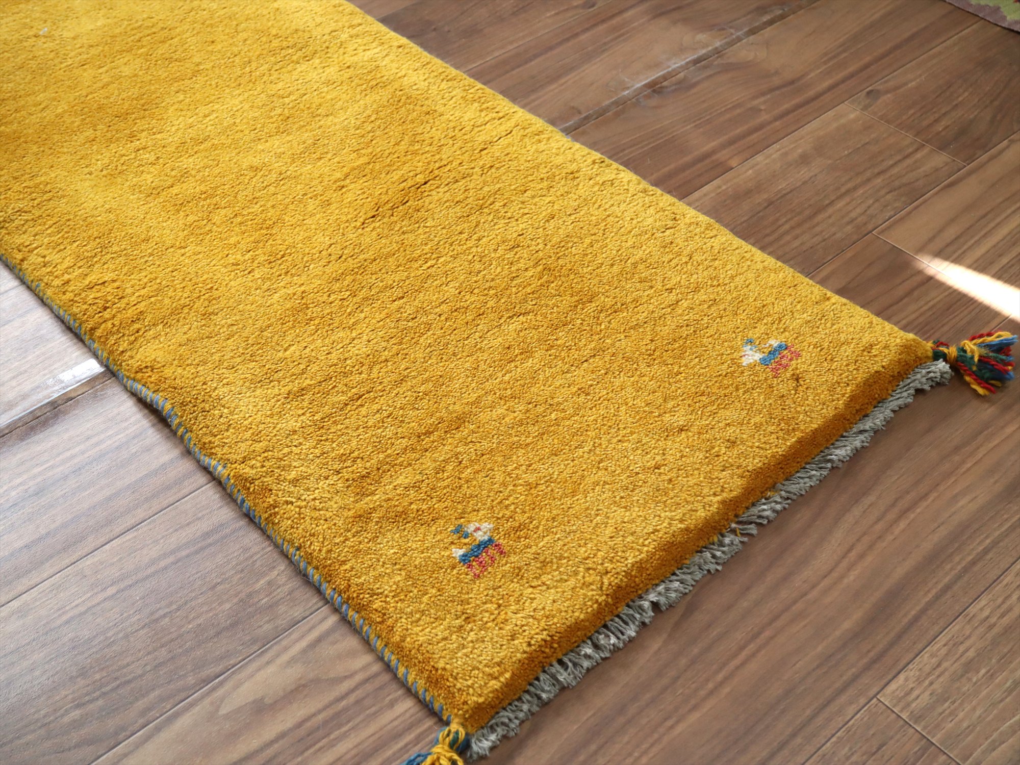- 【15%OFF】ギャッベ イラン 手織り 細長ランナー 143x52cm イエローオレンジ シンプル 無地