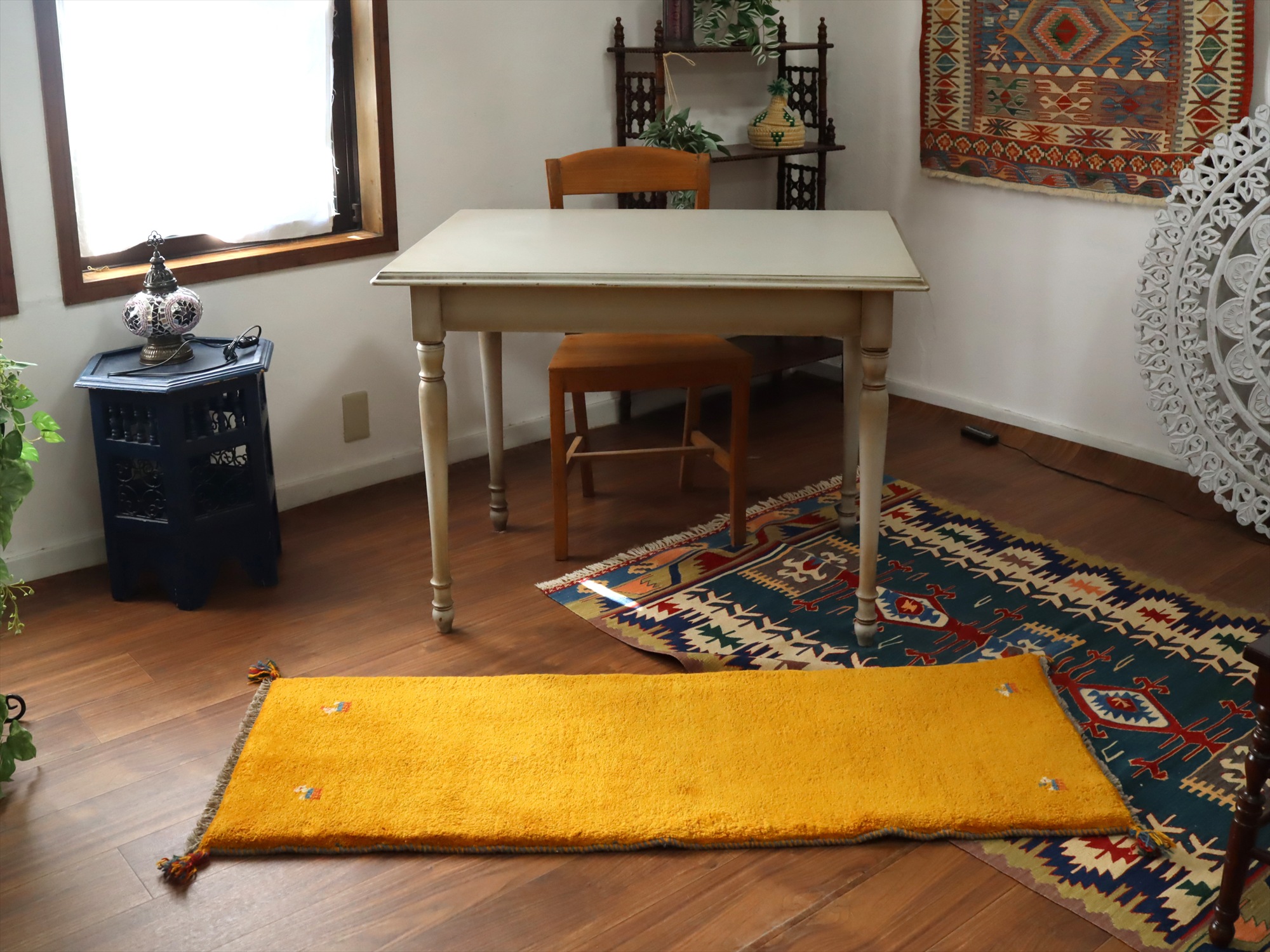 Key:ギャベ, ギャッベ,トライバルラグ,手織りラグ, 手織り絨毯, 部族絨毯, 草木染, カシュカイ族, ウール製, 廊下, ベッドサイド, オレンジ, イエロー, 黄色,一点もの, 手織り, 現品販売, 東京、中野区, ガラタバザール, Gabbeh, Tribal Rug, Hand knotted, wool, Natural dye, Shiraz, Fars, Quashkai
