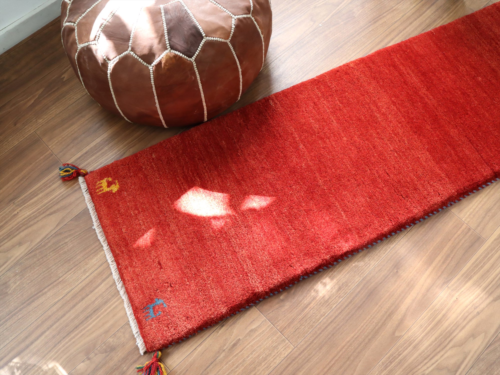 - 【15%OFF】ギャッベ イラン 手織り 細長ランナー 146x50cm レッド シンプル 無地