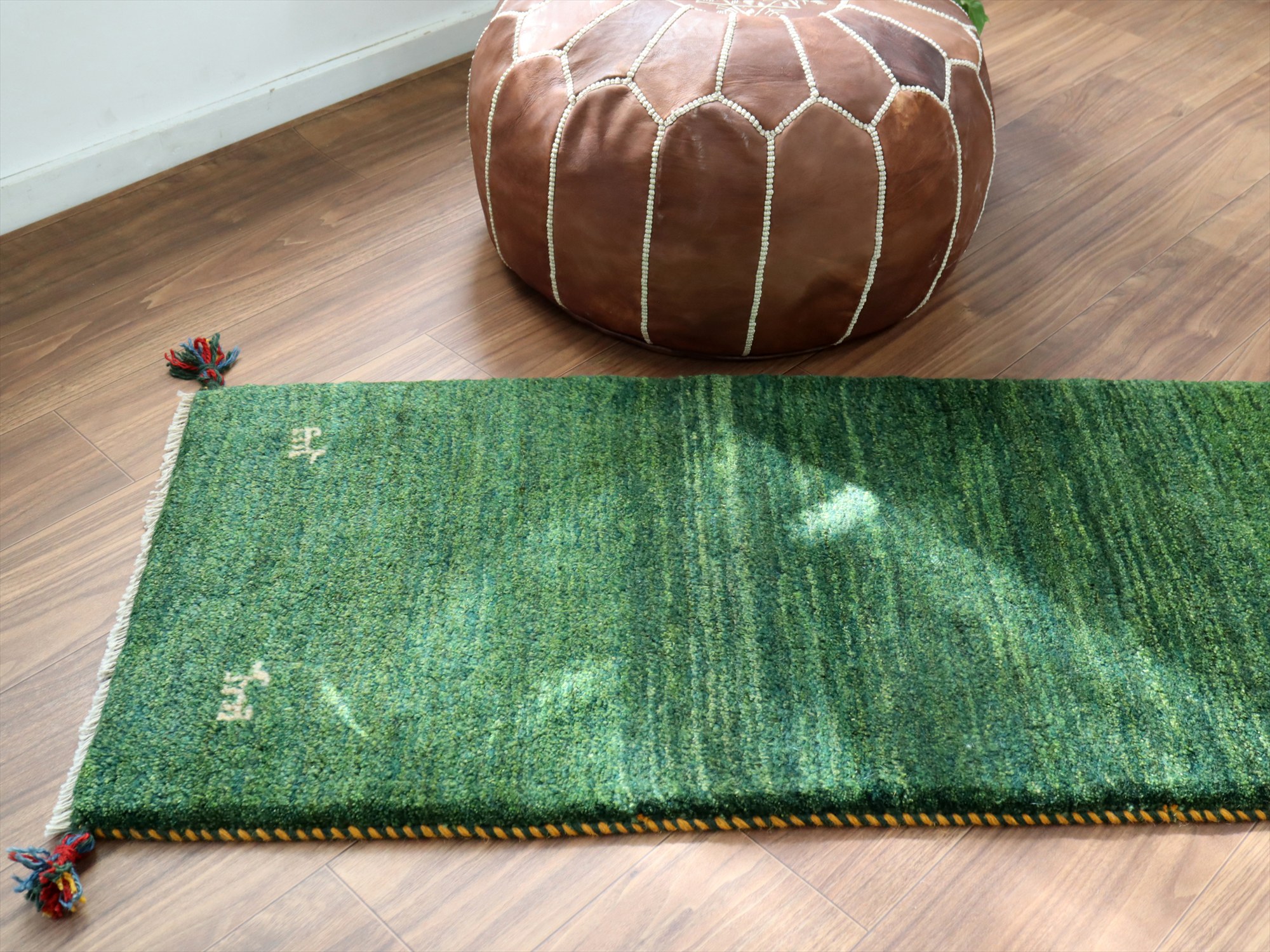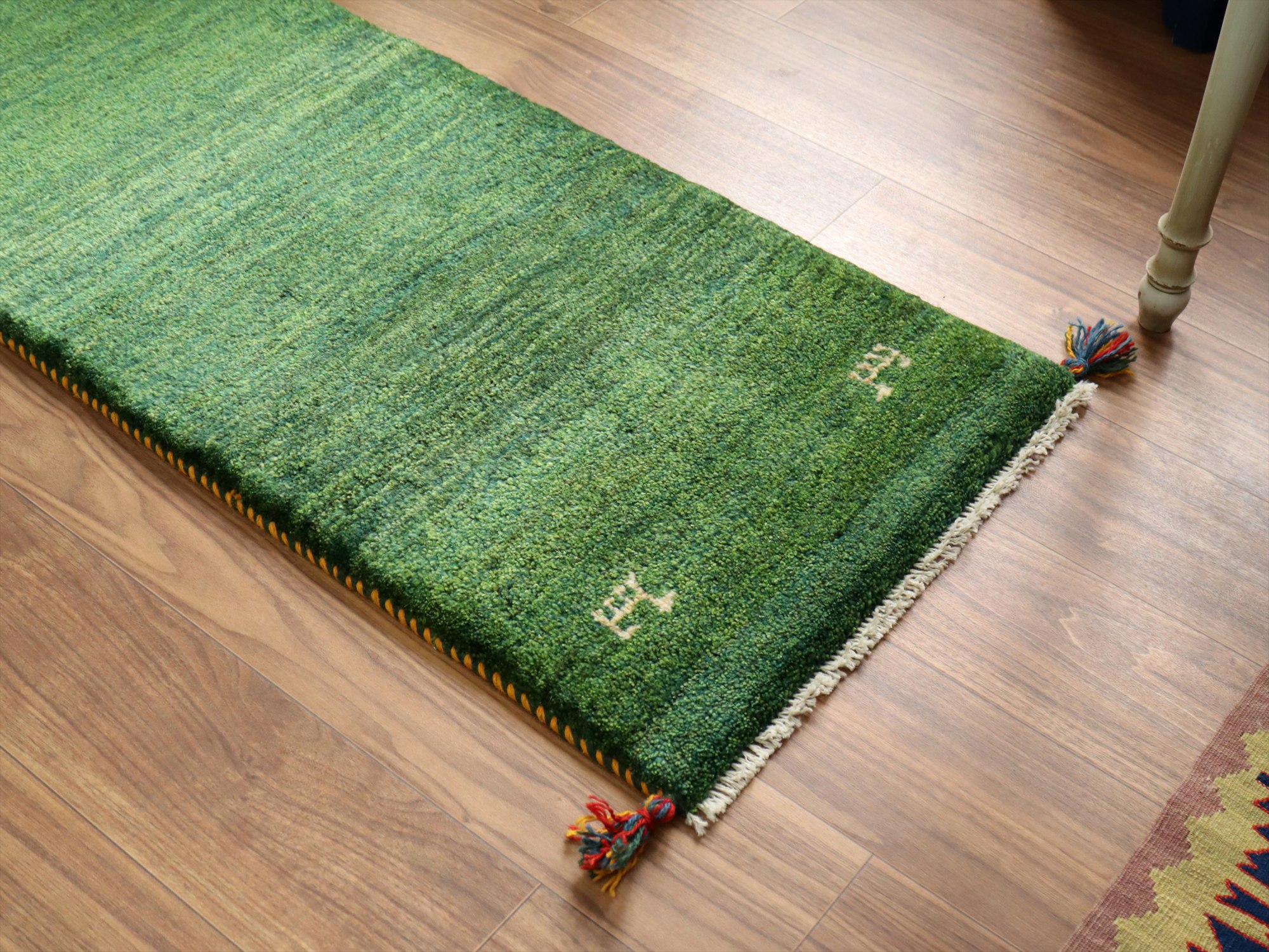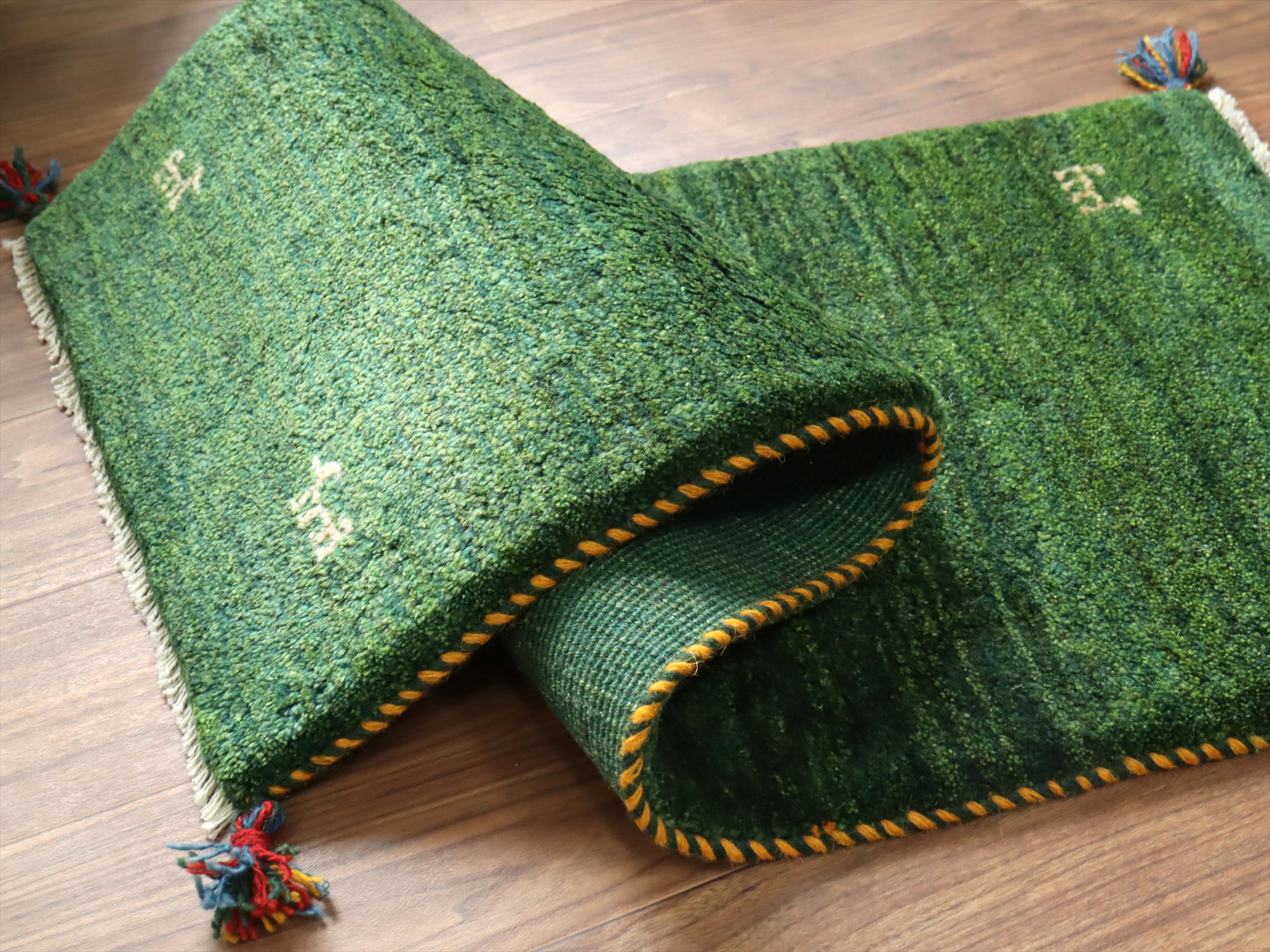 【15%OFF】ギャッベ イラン 手織り ミニランナー 125x54cm シンプル 無地 グリーン 自然な色ムラ