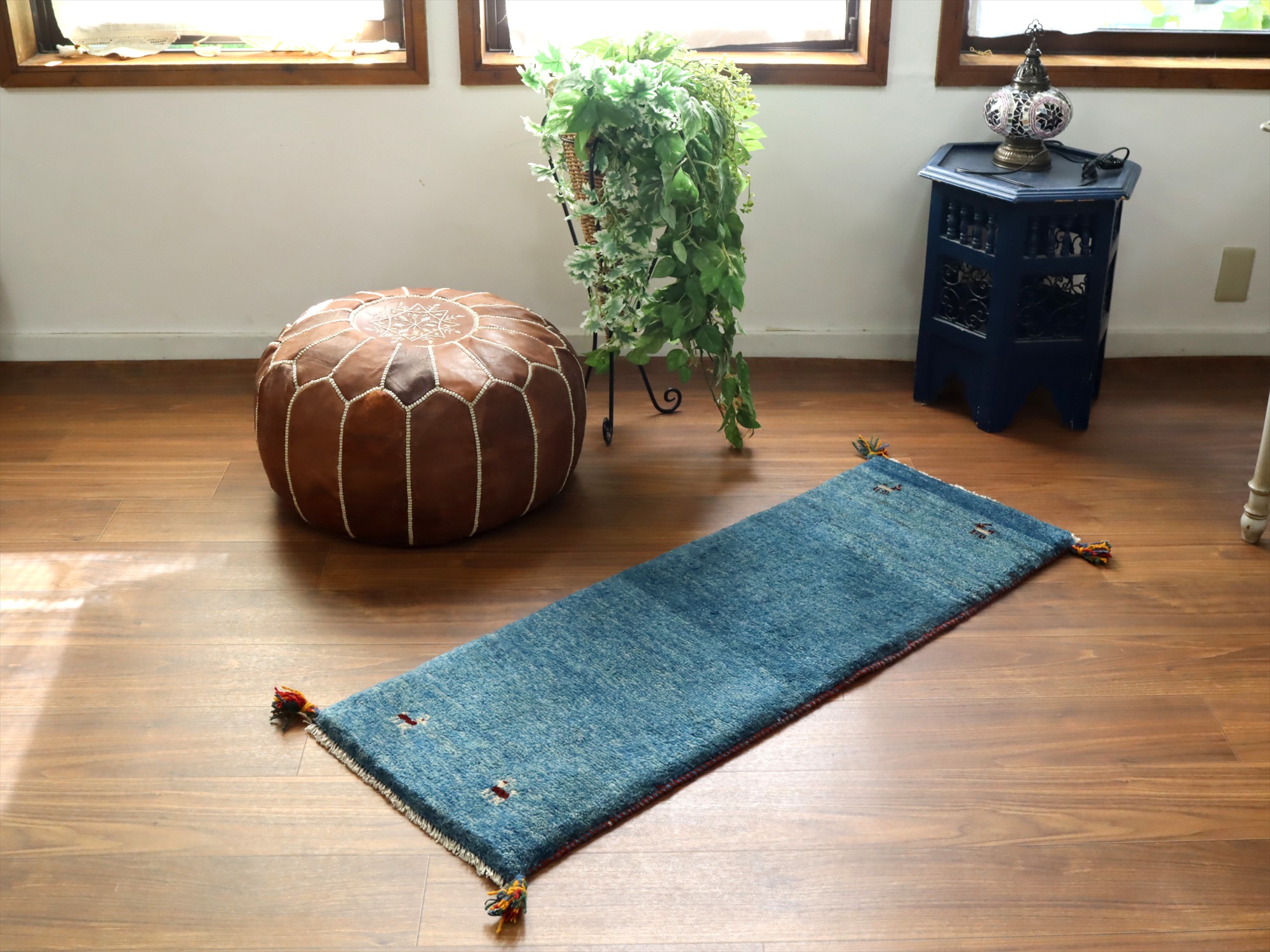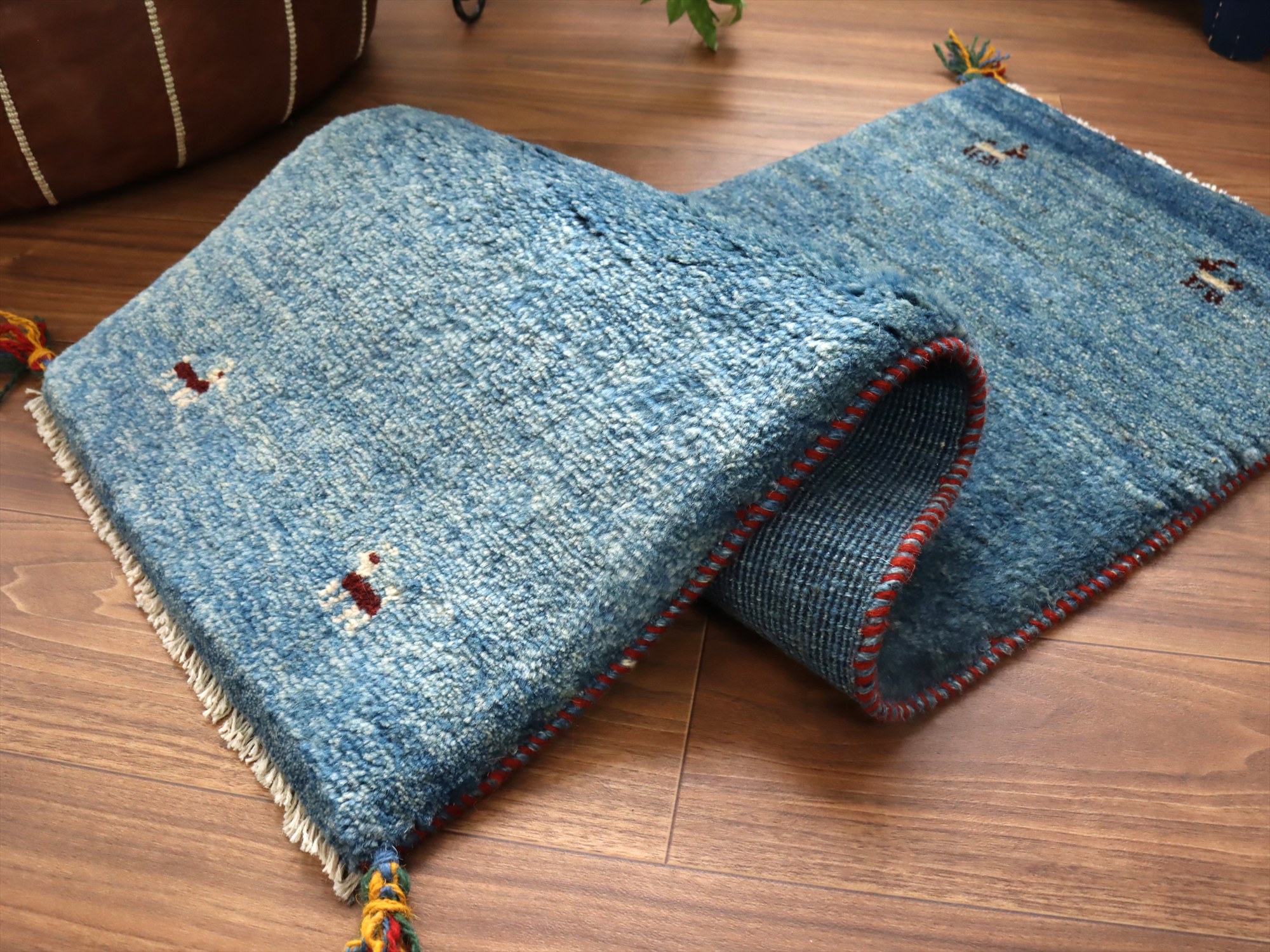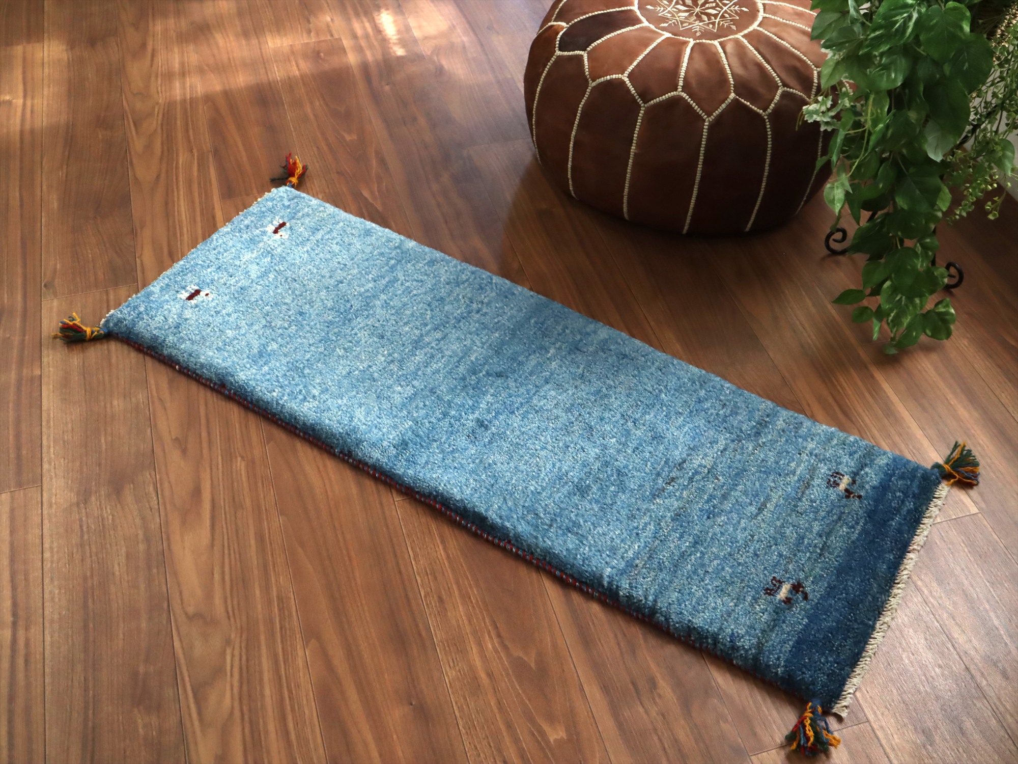 【15%OFF】ギャッベ イラン 手織り ミニランナー 120x42cm ブルー 自然な色ムラ シンプル 無地