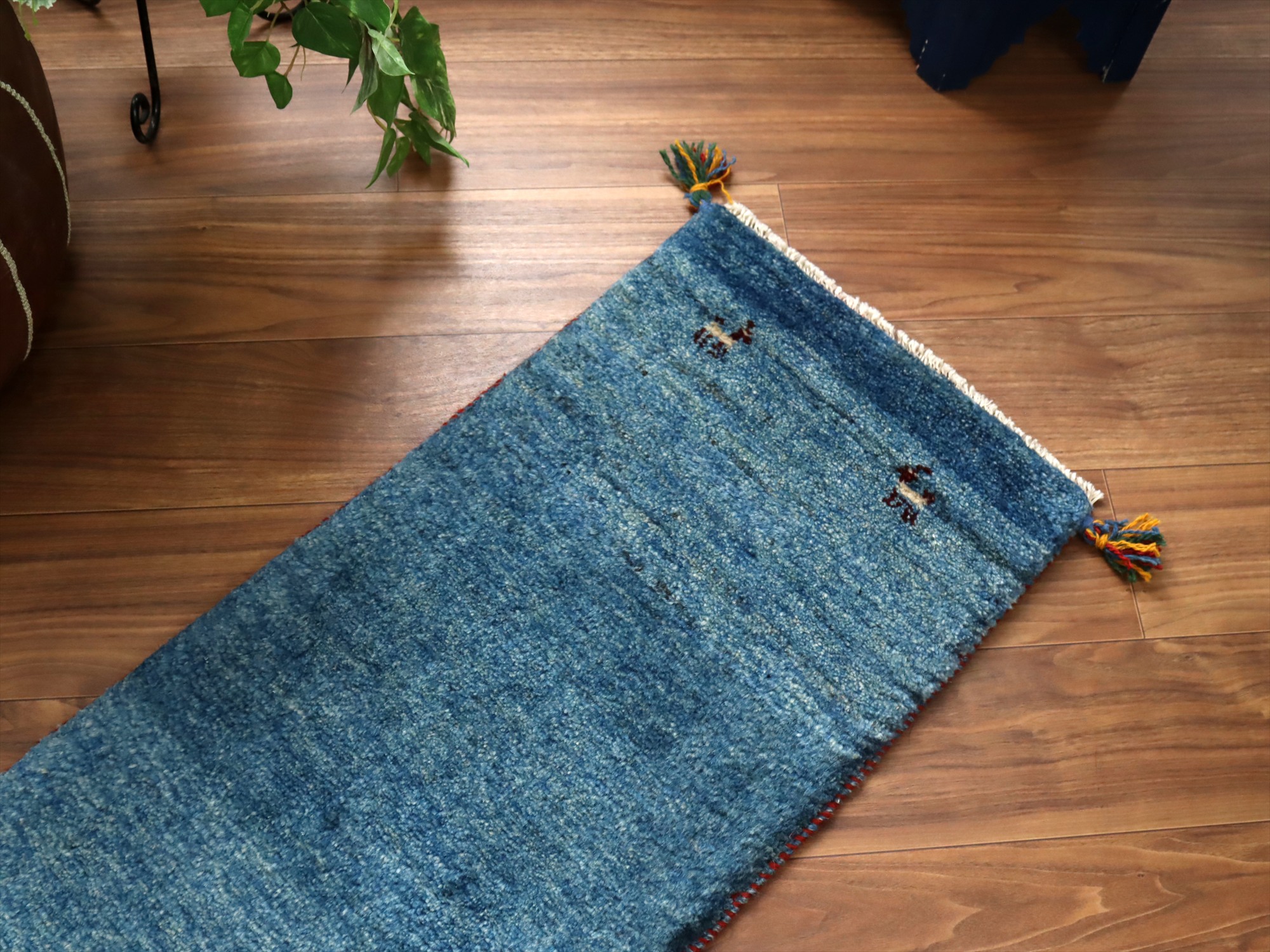 - 【15%OFF】ギャッベ イラン 手織り ミニランナー 120x42cm ブルー 自然な色ムラ シンプル 無地