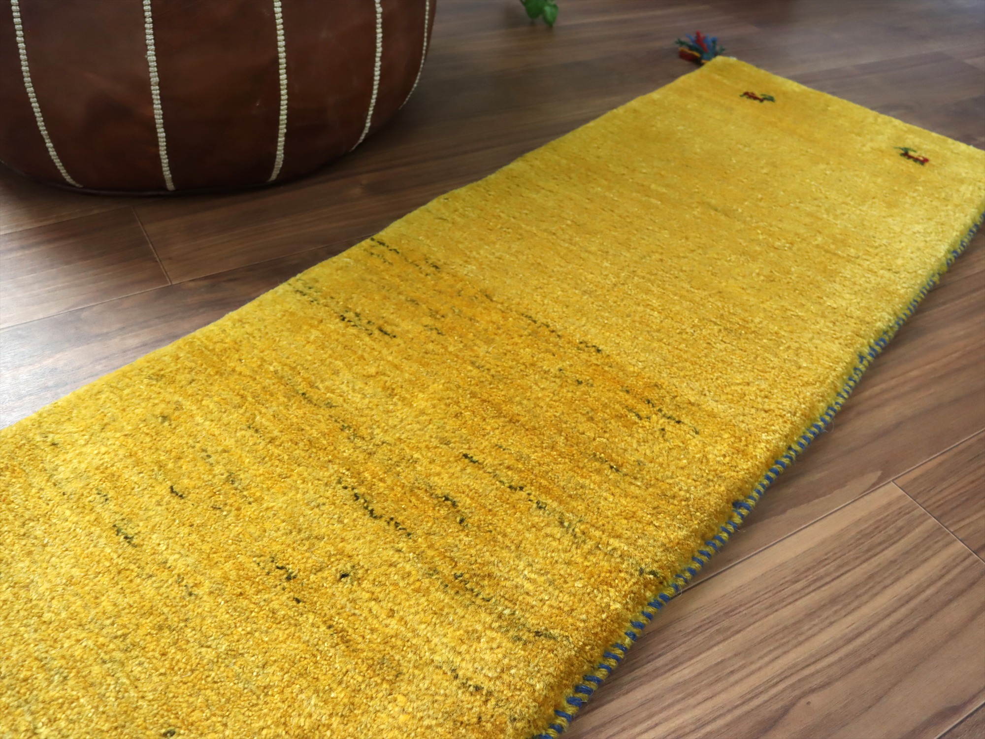 - 【15%OFF】ギャッベ イラン 手織り ミニランナー 120x43cm イエロー 自然な色ムラ シンプル 無地