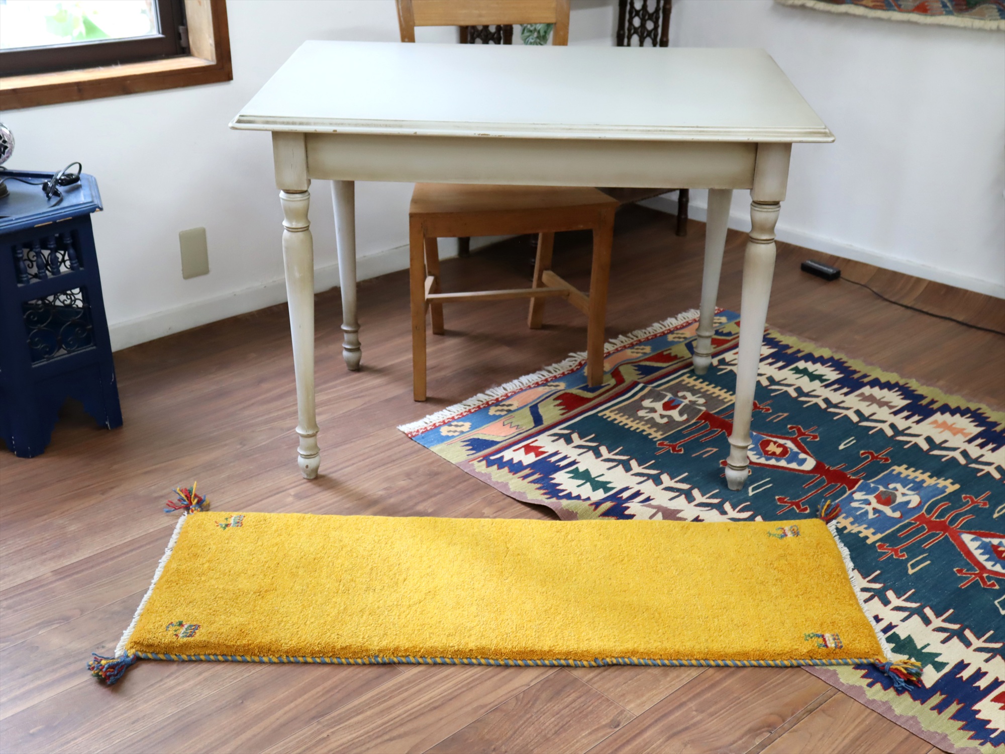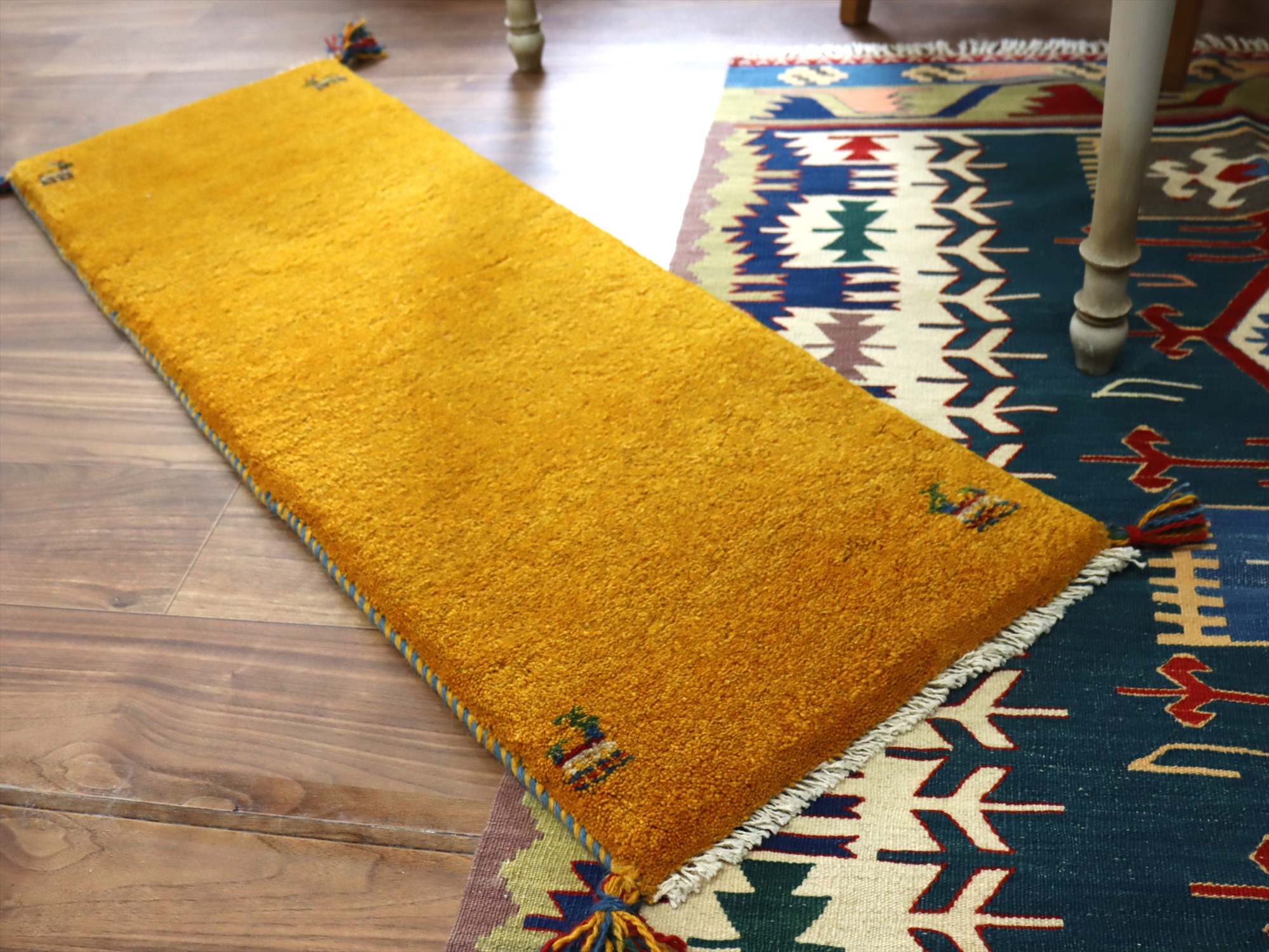 Key:ギャベ, ギャッベ,トライバルラグ,手織りラグ, 手織り絨毯, 部族絨毯, 草木染, カシュカイ族, ウール製, 廊下, ベッドサイド, オレンジ, イエロー, 黄色,一点もの, 手織り, 現品販売, 東京、中野区, ガラタバザール, Gabbeh, Tribal Rug, Hand knotted, wool, Natural dye, Shiraz, Fars, Quashkai