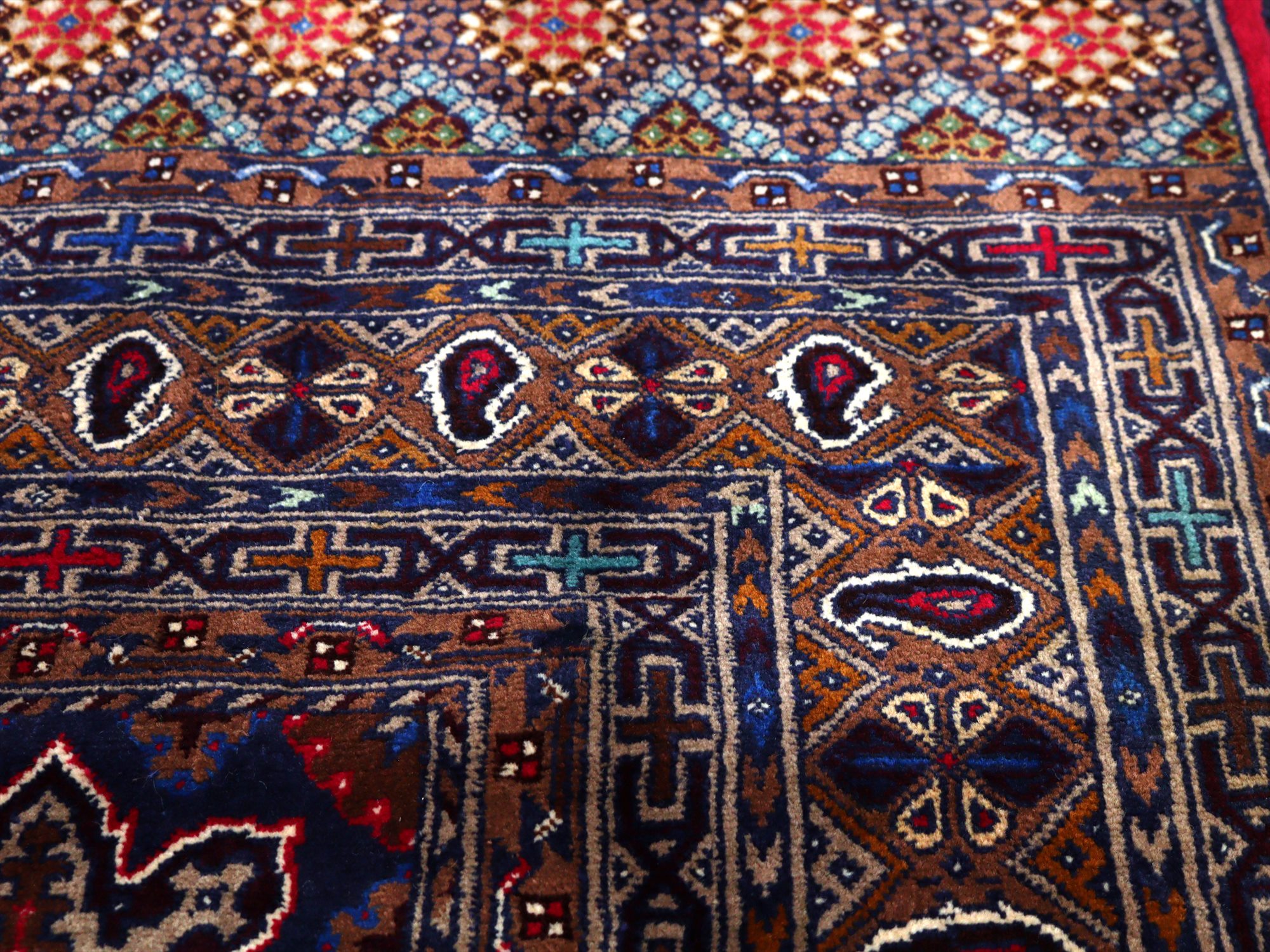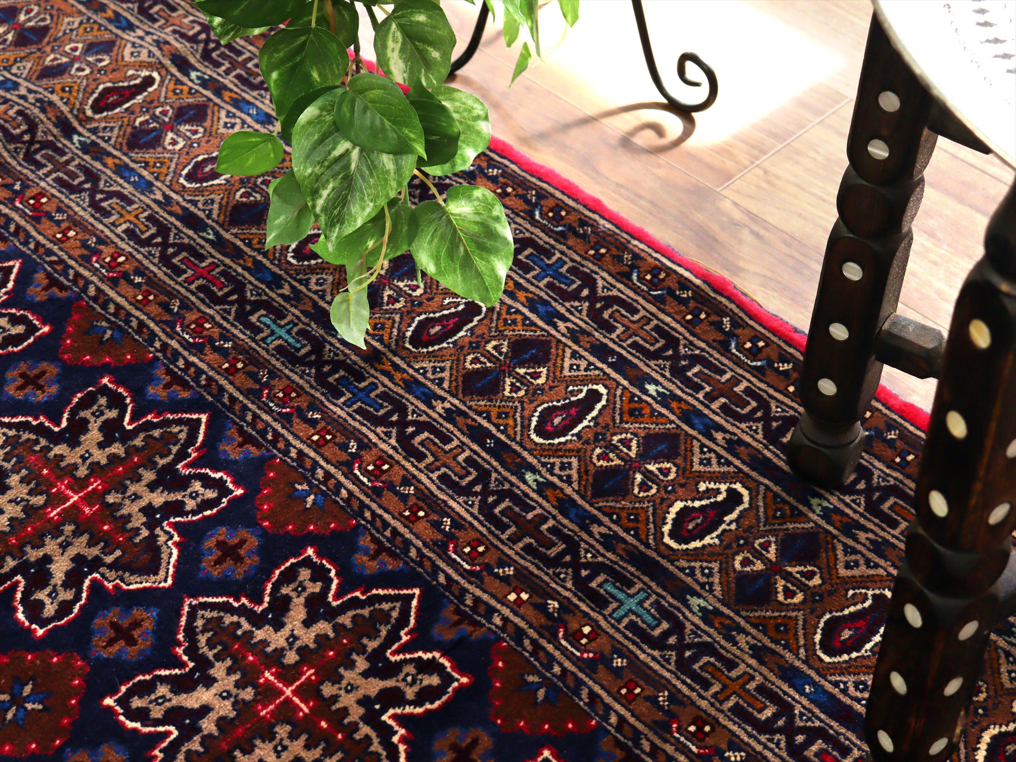 ダークトーンの色ベースに、細かな織りで幾何学模様がきっちりと整列するように織られたデザイン。独特の色使いでエキゾチックな雰囲気がよく出ています。額縁部分には、細く赤の色糸で枠が成されていてアクセントになっています。