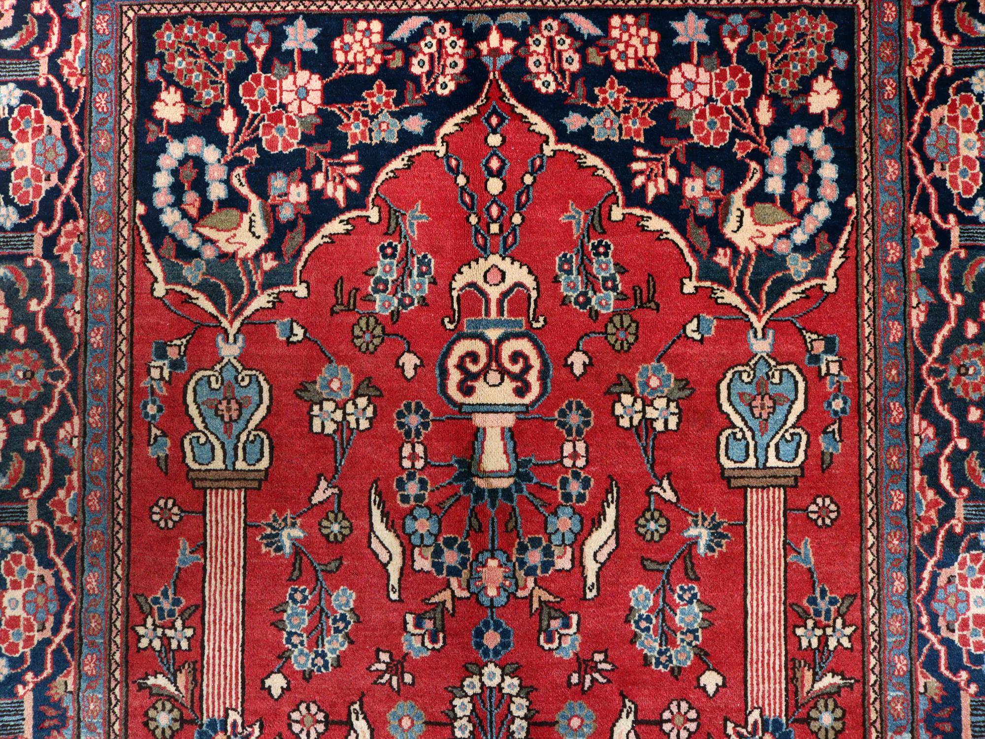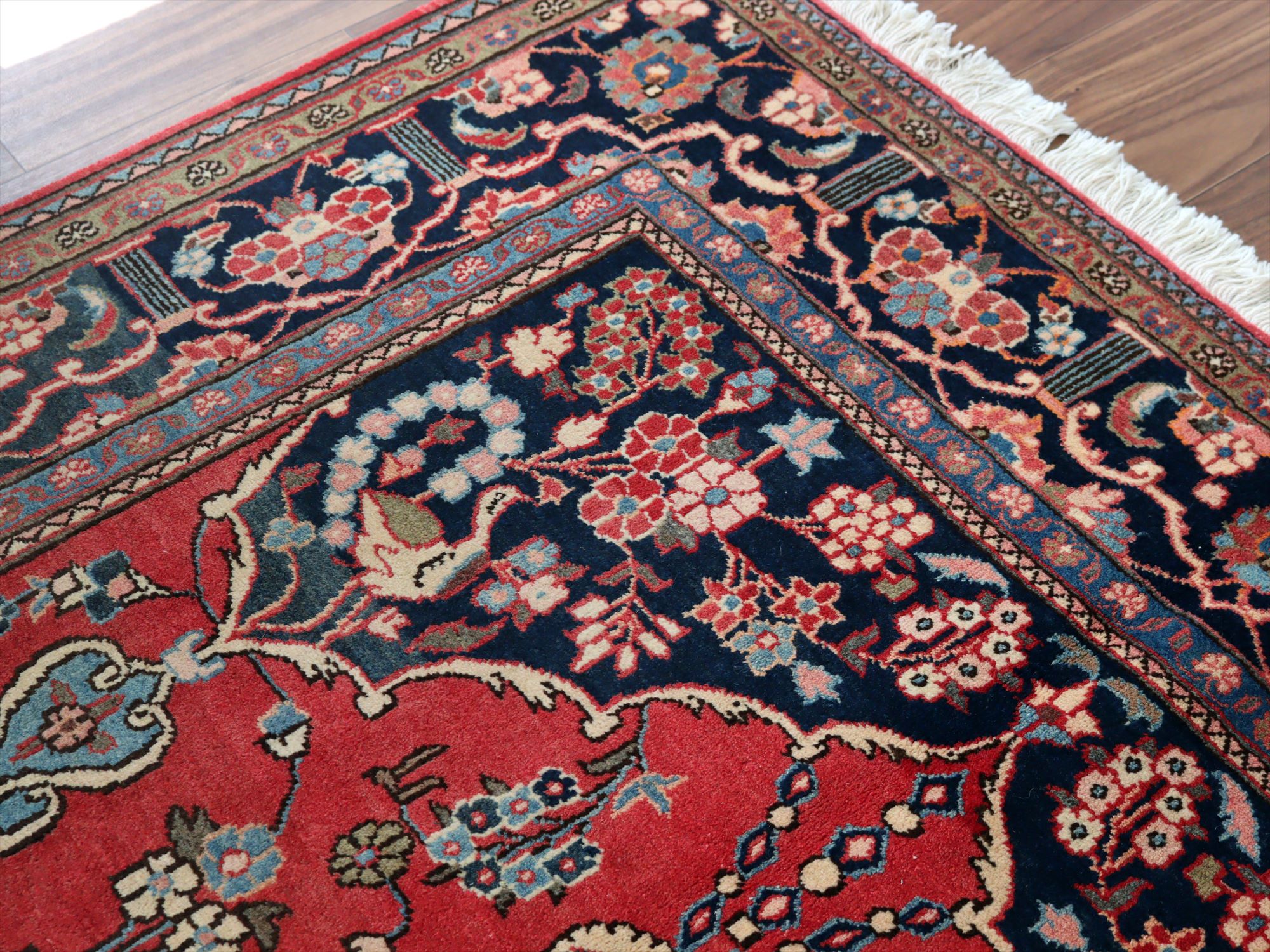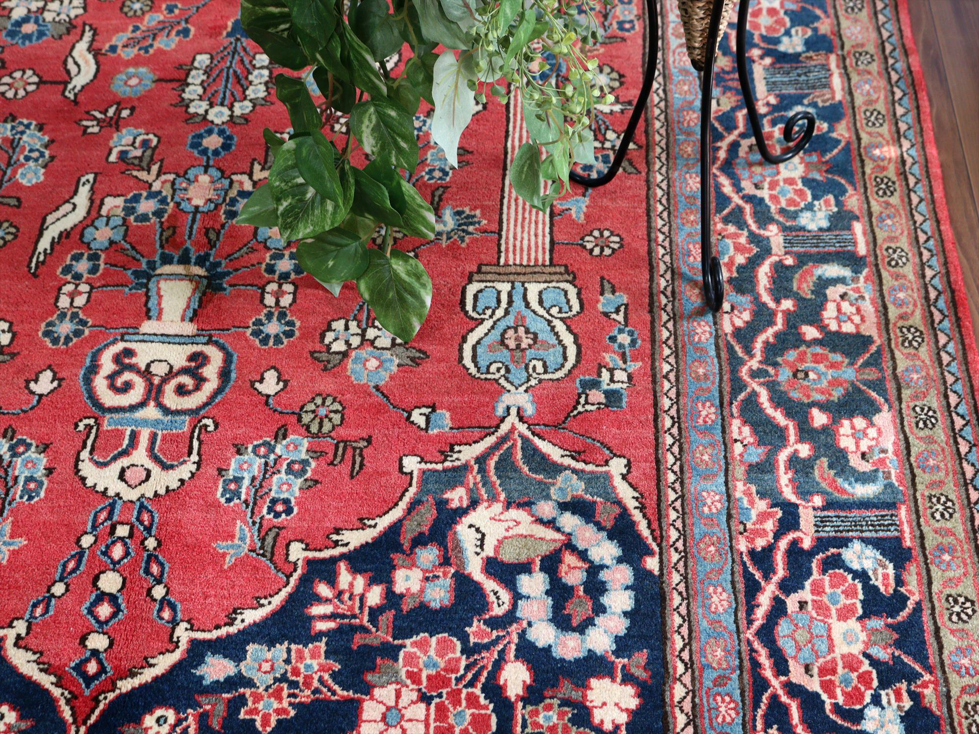 美しい曲線で描いたデザインが特長的なカシャーンの絨毯。細かな織りで、鳥や花、それにミフラープが優雅で上品に表現されています。抑えた朱赤と、額縁のネイビーの丁度よいトーンバランスがデザインの美しさを引き立てます。